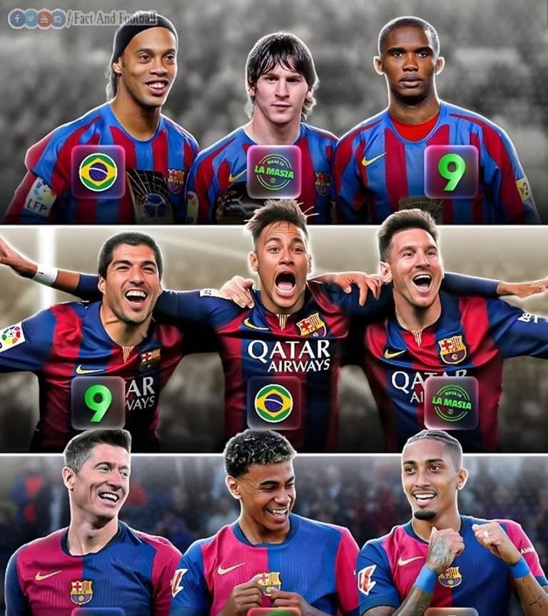 标配? 巴萨现在的进攻线配置“走在正确的道路上?” 这位作者的观点可太有意思了,经过多年的观察,巴塞罗那2000年以后的辉煌时代,其攻击线构成少不了三种元素: 1、世界级青训天才:以往是梅西,现在是亚马尔,都是左脚右边锋; 2、一位优秀中锋:以往有埃托奥,接任是苏亚雷斯,现在莱万多夫斯基,都是效率极高的射手。 3、一位巴西超级边锋:以往小罗,接着是内马尔,现在是拉菲尼亚。 #巴萨# #巴萨锋线重构# #巴萨运营策略# #巴萨新三叉戟# #足球#