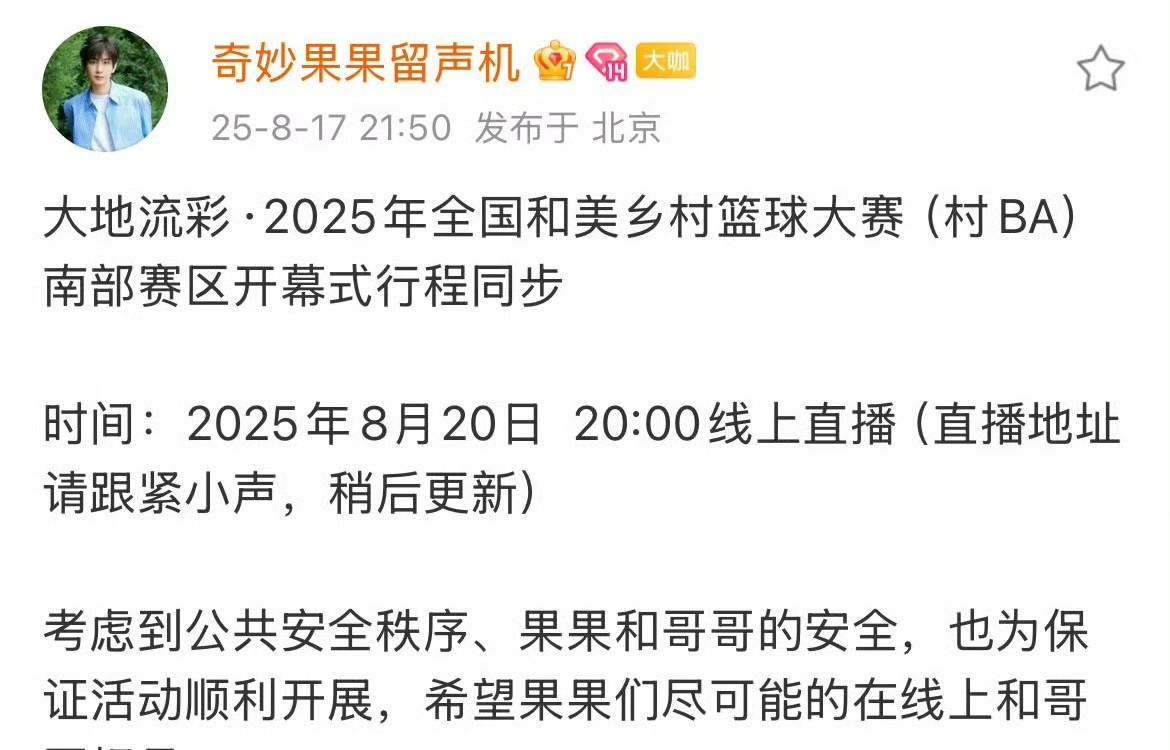 明晚8月20日20:00直播,考虑到公共安全秩序、果果和哥哥的安全,也为保证活动顺利开展,希望果果们尽可能的在线上和哥哥见面,嗯嗯!明晚线上见![舔屏]