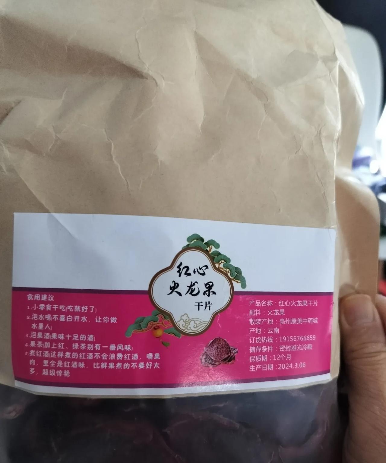 国内海运来的火龙果晒干切片,泡水很甜,好喝。喝完果肉泡软了,很好吃。 澳洲火龙果特别昂贵,买一只鲜果可以在国内买40-50只。