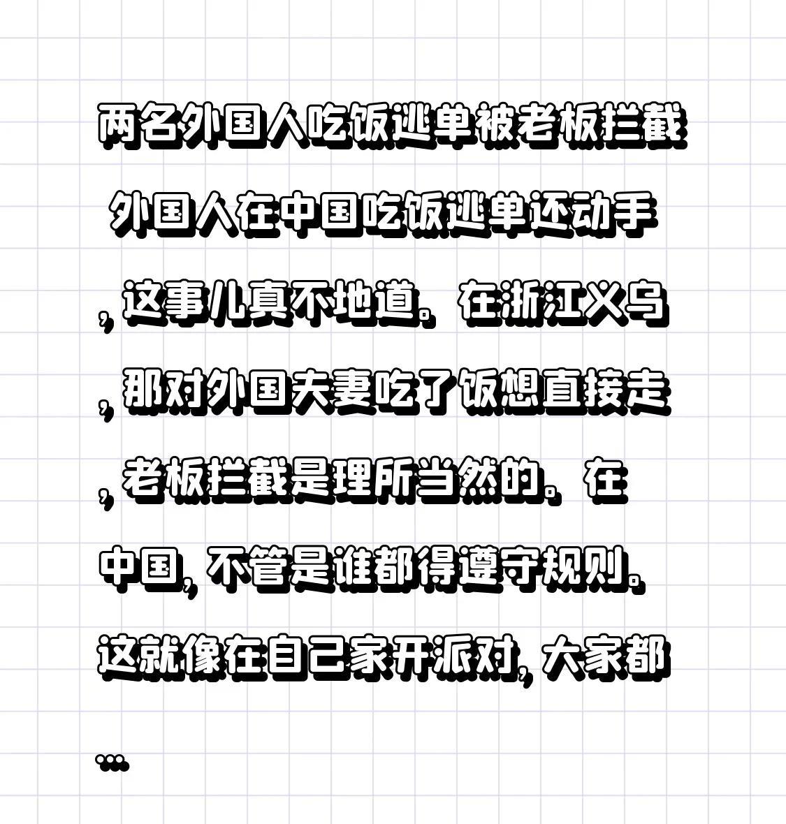 两名外国人吃饭逃单被老板拦截 有这么一件事。两名外国人吃饭逃单,被老板给拦住了,这事儿可真不地道,而且还是发生在中国呢。 在浙江义乌的一家饭馆里,有一对外国夫妇。他们吃完饭就想直接溜之大吉。老板哪能让他们得逞呢?肯定得拦住啊。在中国的土地上,不管是谁,都得遵守这儿的规矩。这就像在自家开聚会一样,大家都好好地按照游戏规则来,突然来个外人要破坏规则,那怎么行呢? 可那女的被拦住后,还大声地狡辩呢。明明自己没理,却还特别张狂,到最后竟然还动手推人。这就看得出来,有些人就是仗着自己有点特殊身份,就想搞特殊。但是在中国,不管你是哪国人,都是同等对待的,吃了饭就得付钱。 #饭店逃单# #逃单纠纷# #老外就餐#