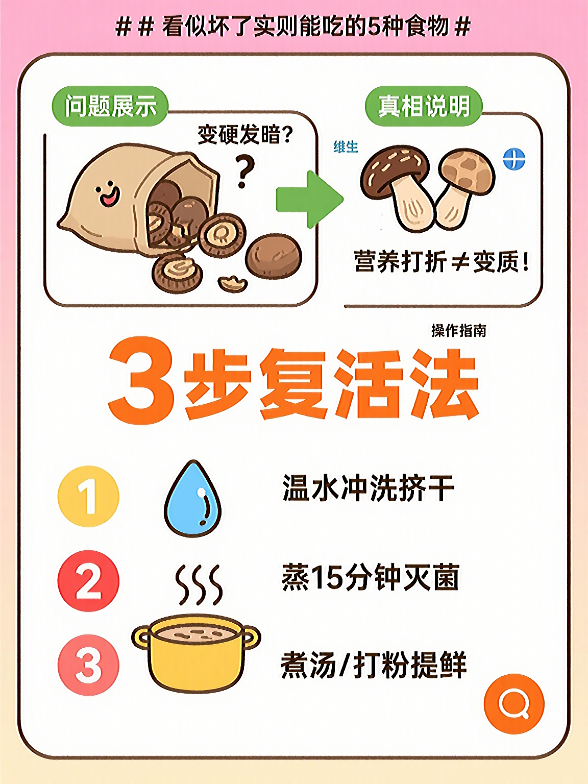 ▌干香菇变硬、颜色发暗——营养打折≠不能吃! 三步复活法:温水冲洗表面,挤干水分;上锅蒸15分钟(高温灭菌);煮汤或打粉作调料,鲜味依旧。