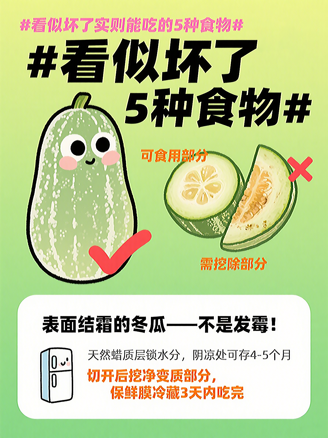 ▌表面结霜的冬瓜——不是发霉,是天然保鲜层! 冬瓜表皮有均匀白霜且无黑斑?别慌!这是它分泌的天然蜡质层,能锁住水分。正确操作:垫木板放阴凉处(别直接接地气),能存4-5个月。若切开后瓜瓤软烂,只需挖净变质部分,剩余部分用保鲜膜包紧冷藏,3天内吃完即可。