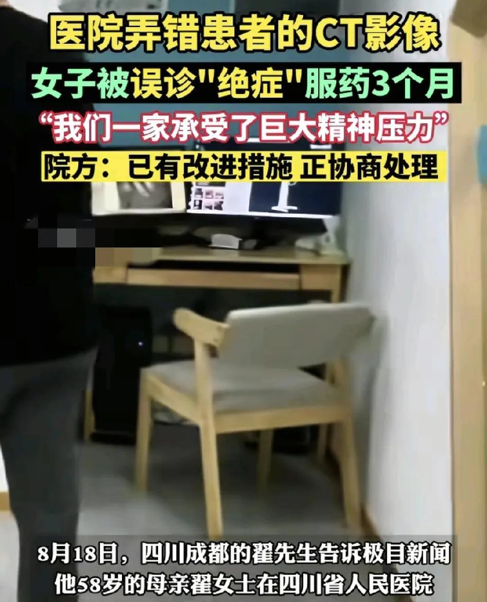 四川成都一位网友称他的母亲在某医院检查ct的时候,由于另外一位患者误入了检查室,导致另外患者的影像录入了他母亲的名下,后来检查结果被诊断为绝症。这几个月来他母亲一直在服药,全家人也遭受了全家人极大的精神压力,后来复查才发现是被误诊了。现在家属与医院在积极协调沟通,医院方面表示已经在更新设备防止此类情况的再次发生。想想真的很害怕,另外一位患者诊断的结果是正常,而却没有得到及时的治疗。