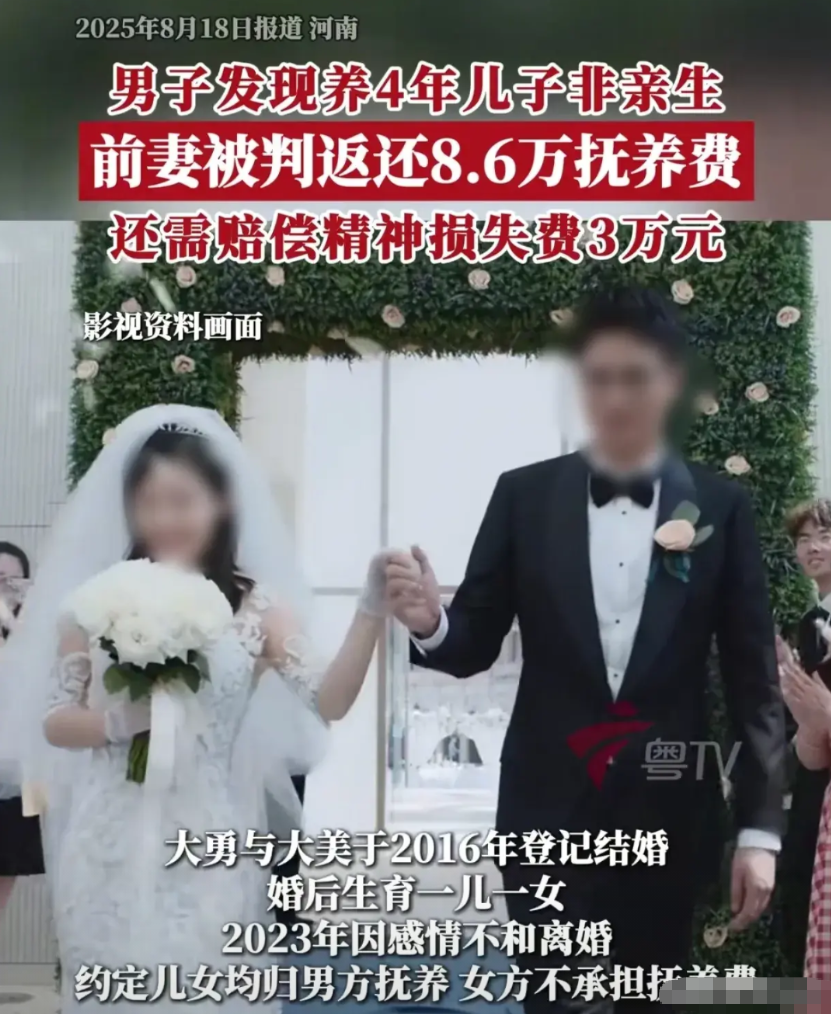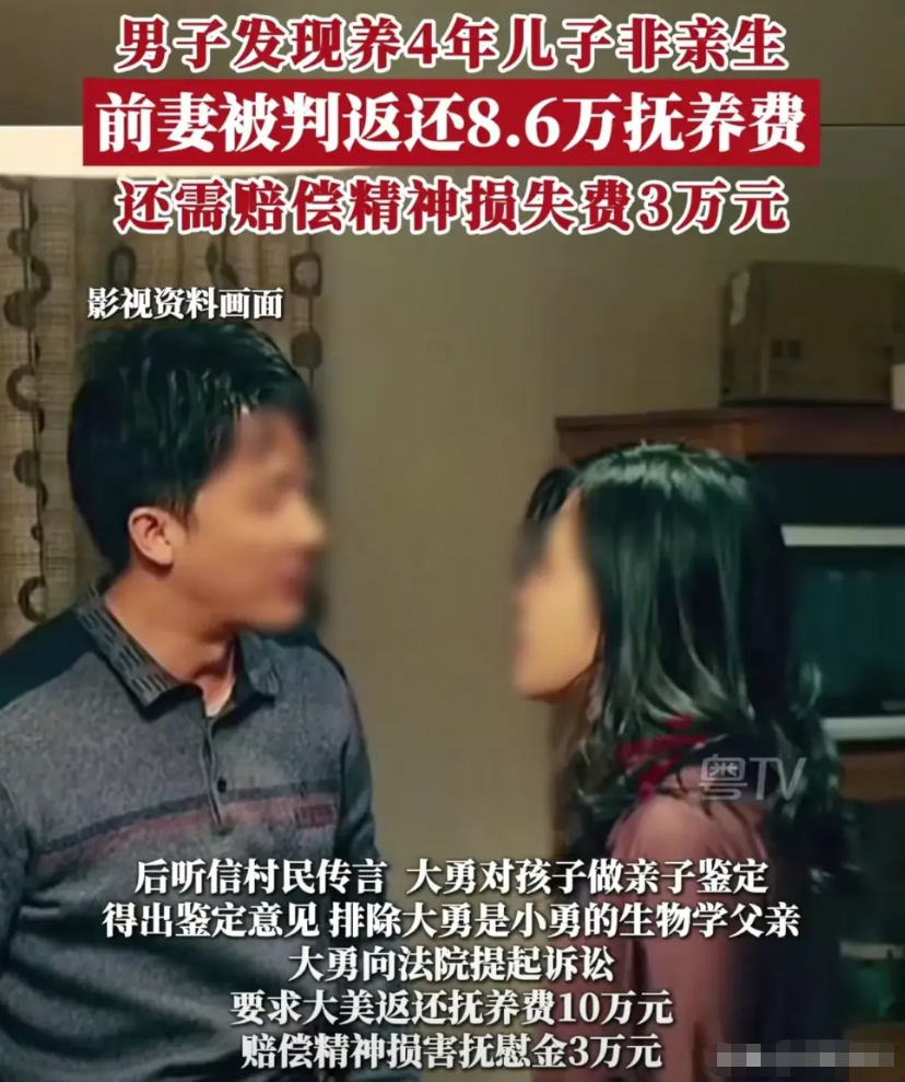 8月18日深圳新闻网报道了一起男子发现抚养了4年的儿子非自己亲生,将前妻告上法庭,索要抚养费和精神赔偿的案例。