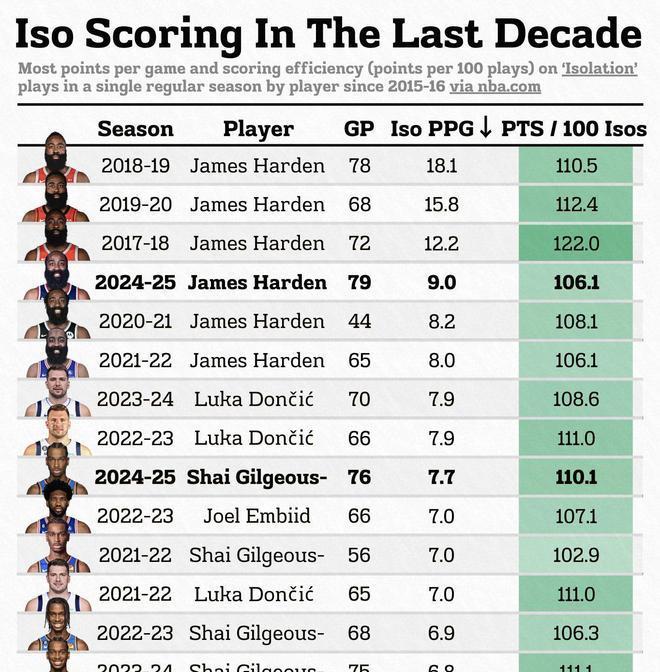 过去十年常规赛场均单打得分排名,哈登包揽前六 8月18日讯 有网友根据NBA官方统计数据制作了一张过去十年常规赛个人单打得分数据排行榜。这份排名区间是从2015-2016赛季开始统计,直至2024-2025赛季结束的完整十个赛季。 值得一提的是,詹姆斯·哈登占据了该榜单中的前六位。2018-2019赛季,他在火箭场均靠单打可以得到18.1分,2019-2020赛季、2017-2018赛季、2024-2025赛季、2020-2021赛季以及2021-2022赛季,哈登场均靠单打分别可以得到15.8分、12.2分、9.0分、8.2分以及8.0分。 在该图表中最后一列的“每百回合单打得分”的统计中,2017-2018赛季的哈登在常规赛场均可以得到122分,位列第一。