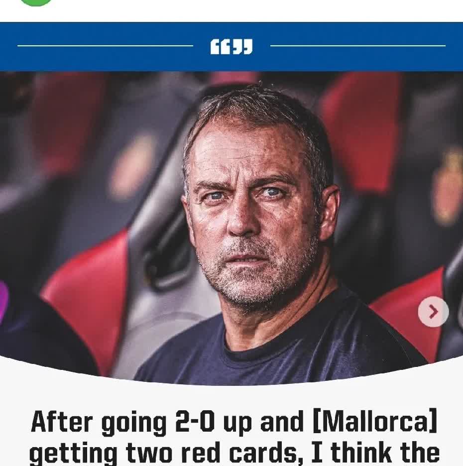 【德国人的字典里没有“人情”两个字,这下你知道他为何可以带领拜仁8-2巴萨了吧?】弗里克对巴萨西甲首轮的表现提出了严厉批评! 🔴他认为球队在对阵马洛卡2-0领先而且对手拿了两张红牌后球队就放松了,只拿出了50%的状态,而球队本可以做得更好。弗里克说他不喜欢球员们这样放松,我们要进更多的球,面对对方9名球员只拿出五六成的态度是不能接受的…… 🔵这下大家知道他为何可以带领拜仁8-2大胜巴萨了吧?手下留情是不存在的!