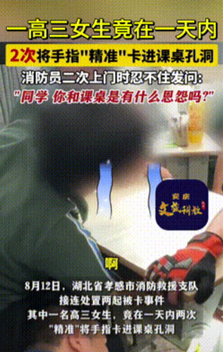 这下闹笑话了!”湖北孝感,一高三女生居然在同一天里,手指连续两次被卡在课桌孔洞里!就在消防员第二次进行援救时,禁不住对女生提出了“灵魂拷问”!网友:这课桌莫不成是有什么磁铁? 8月12日,孝感一高三女生正收拾课桌,可突然就发现右手的两根手指,一起卡在了课桌底板的金属孔里,这孔洞也就手指粗细,边缘还特别锋利,她越着急往外拔,手指就肿得越厉害,最后直接卡得死死的。 消防员赶到后,又是垫纸片又是用专业工具,费了好大劲儿才解救出来,谁都以为这事儿就算完了,可谁能想到,当天晚上女生又出状况了! 没想到这次是左手接力,再次卡在了新课桌的同一个位置,消防员再次赶到时都傻眼了,一边处理一边忍不住问:“同学,你和课桌是有什么恩怨吗?” 这事儿传到网上后,网友们都快笑疯了,有人说“姑娘这是要挑战吉尼斯纪录啊”,不过笑归笑,仔细想想这事还挺值得深思的。 有些学校的课桌设计确实存在安全隐患,那些小孔洞看着不起眼,但真要卡住手指可不是闹着玩的,消防员说,遇到这种情况千万别硬拽,最好先用肥皂水润滑,实在不行就赶紧报警。 当然,咱们自己也得长个心眼,平时用课桌的时候多注意点,别老往那些小孔洞里伸手,安全这事,光靠别人提醒不够,自己也得时刻放在心上。 大家说说看,你们学校的课桌有没有类似的安全隐患?要是你遇到这种情况会怎么办?