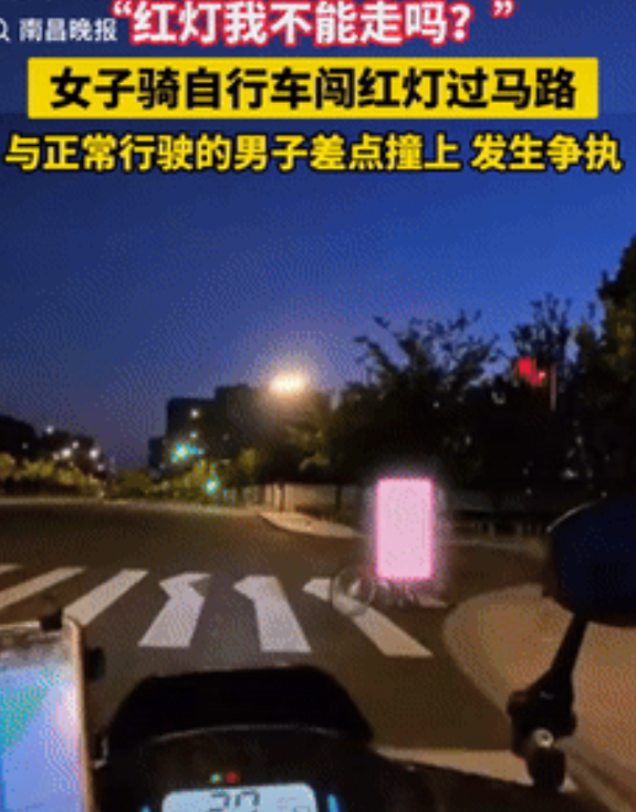 离了大谱!江苏,一女子骑车过马路时闯红灯,差点和正常行驶的电动车撞上,当电动车主质问她时,不料,女子接下来的一句话,竟把电动车主给干沉默了! 据南昌晚报8月19日的报道,当时刚好是晚上,路上的人、车都不多,电动车正准备通过那处路口。 可在他刚开到斑马线时,女子就骑着车出现了,幸好车速并不是很快,所以及时刹住了,不然肯定要撞到一起了。 而对于这种行为,他就感到非常的生气,于是就开口质问女子,不会看红绿灯嘛,那么大的红灯没看到。
