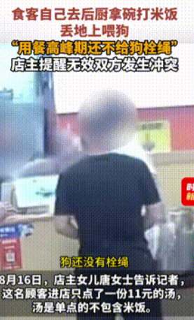 没见过这么缺德的!”江苏南京,一男子带狗到餐馆吃饭,他没经过商家允许,就擅自到厨房拿碗打饭,随后还把米饭、骨头扔在地上喂狗!老板觉得这样很不好,就上前劝说了一下,结果男子直接被激怒,起身就和老板发生了肢体冲突!网友:都是被惯坏了! 8月15日中午,南京一家小饭馆迎来了用餐高峰,店里坐满了人,此时一男子带着狗大摇大摆的进来了,而他就点了一份最便宜的汤。 点餐前,服务员明确告诉他米饭要另外收费,可他就像没听见似的,直接钻进厨房自己动手,更过分的是,他盛完饭不是自己吃,而是往地上一倒,招呼狗过来舔食。 骨头渣子、饭粒弄得满地都是,其他顾客看得直皱眉,老板实在看不下去,走过去委婉地说:“这位先生,我们还要做生意,您这样其他客人没法用餐啊。“ 谁成想这句话直接捅了马蜂窝,这男的一拍桌子站起来,指着老板就开骂,还伸手去戳老板的脑袋,服务员赶紧过来拉架,店里顿时乱成一锅粥。 这通闹腾持续了半个多钟头,最后这男的骂骂咧咧地牵着狗走了,连饭钱都是服务员追出去才要回来的。 网友们看到视频后都气坏了,有人翻出当地养犬管理规定,指出遛狗不拴绳本来就要罚款,更别说还扰乱公共场所秩序。 不少开餐馆的网友也站出来说,最怕遇到这种不讲理的客人,开门做生意讲究和气生财,可也不能任由别人胡来啊。 这次好在没造成更严重的后果,但这种事不能总指望别人忍让,店家开门做生意不容易,其他顾客也是花钱来吃饭的,凭什么要忍受这种糟心事,对这种不讲理的人,该报警就得报警,该罚款就得罚款,不能总让守规矩的人吃亏。 大家说说看,要是您在餐馆遇到这种事,会怎么处理?