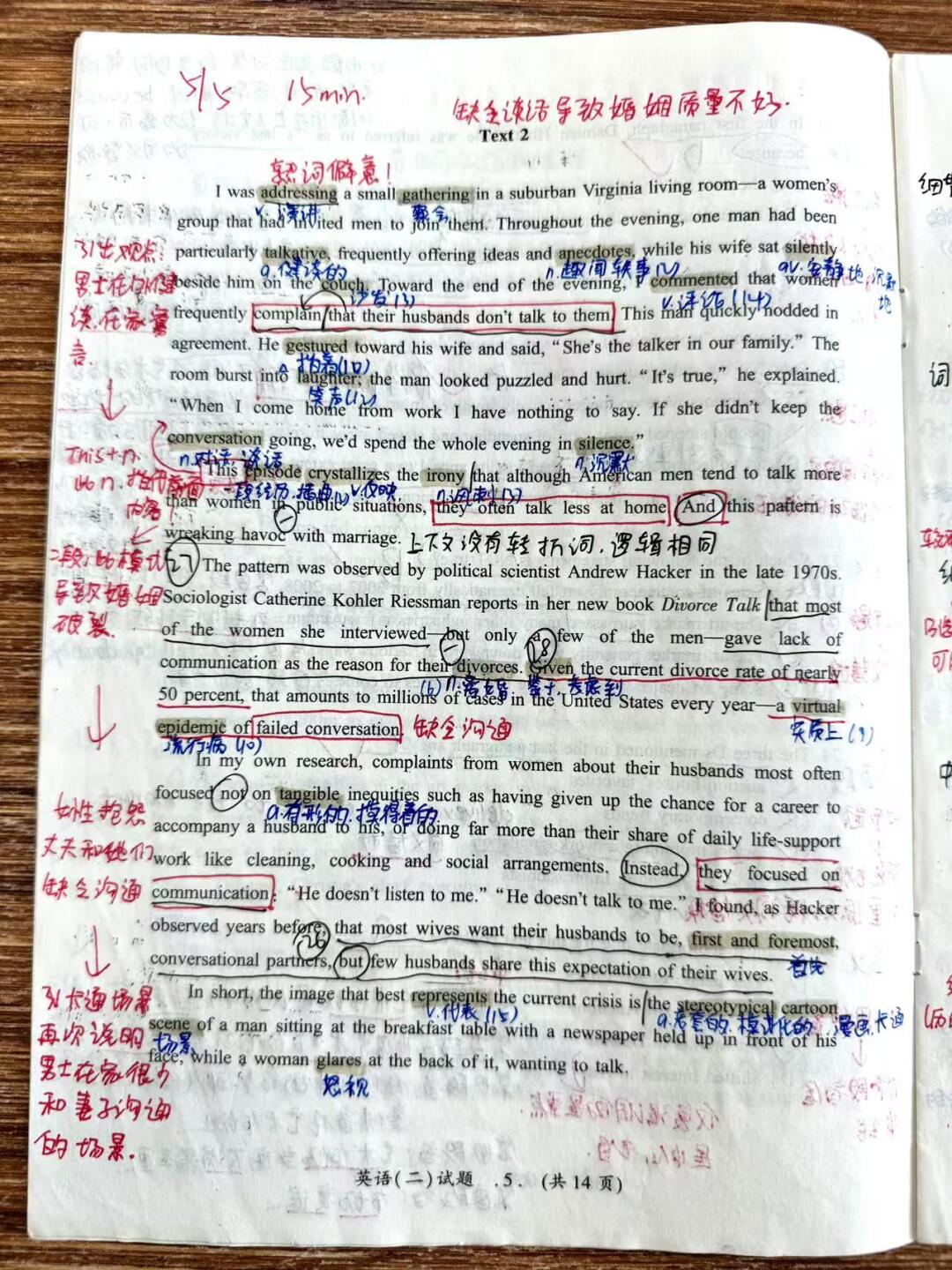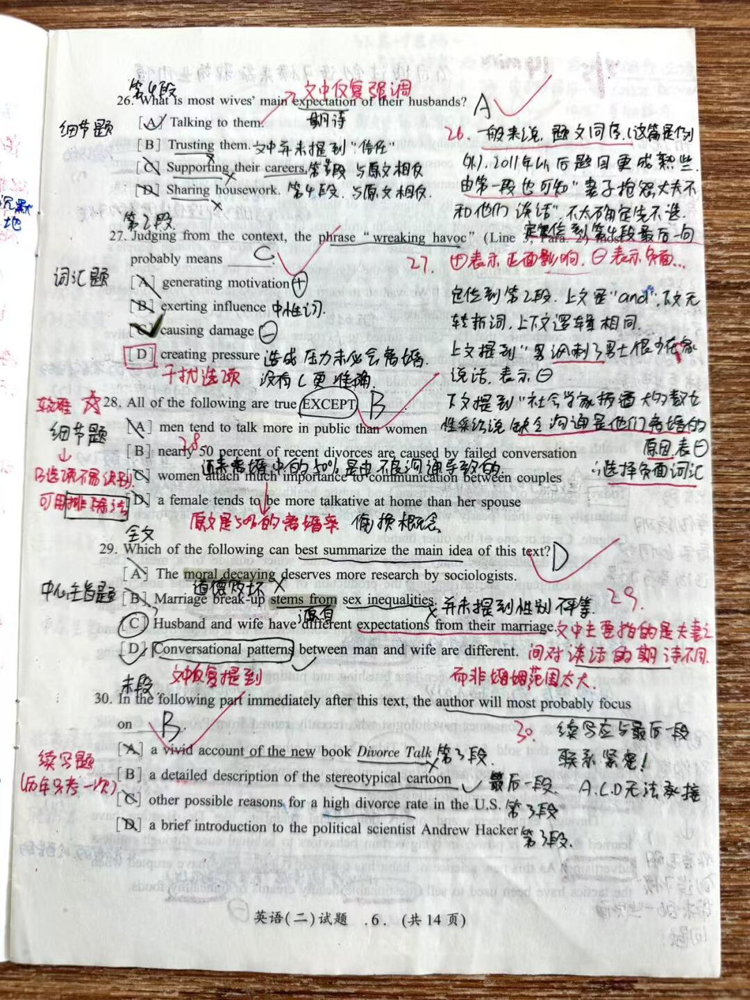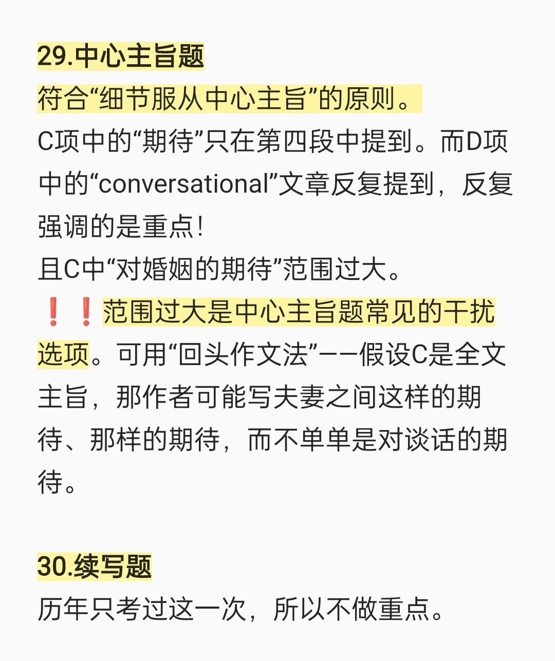 ❗❗范围过大是中心主旨题常见的干扰选项。可用“回头作文法”——假设C是全文主旨,那作者可能写夫妻之间这样的期待、那样的期待,而不单单是对谈话的期待。