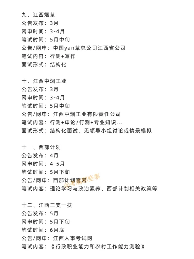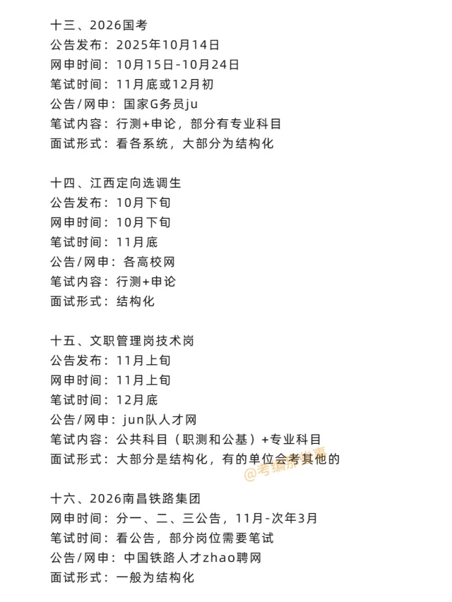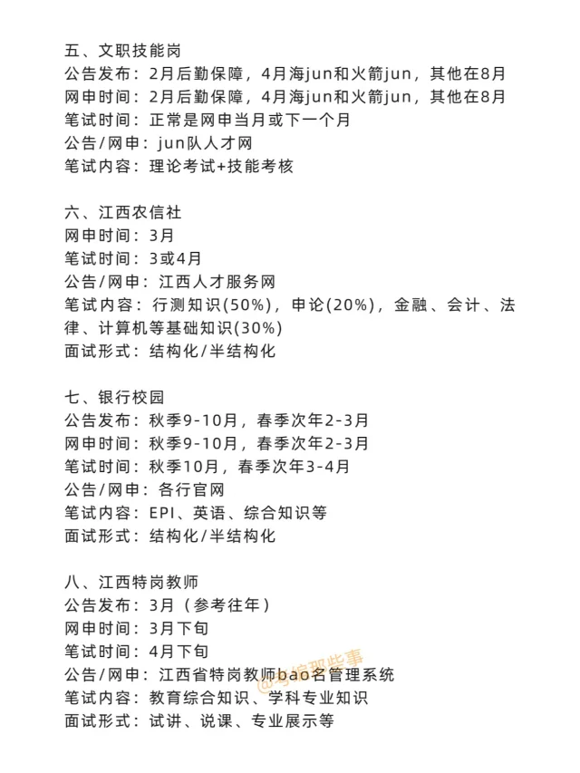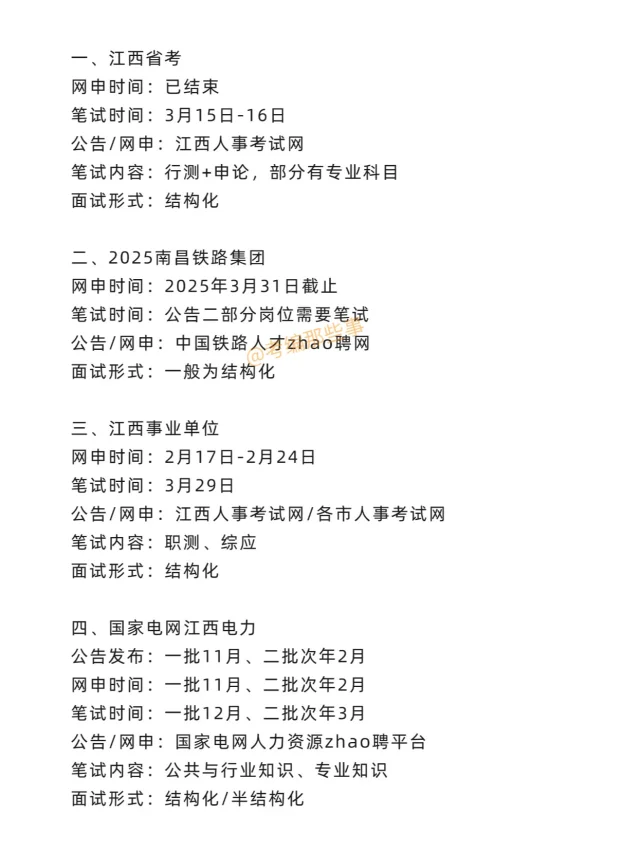 江西省考网申已结束,等待笔试(3月15日-16日),江西事业单位网申2月17日-2月24日,笔试3月29日 - 🍄🍄2025南昌铁路集团 网申时间:2025年3月31日截止 笔试时间:公告二部分岗位需要笔试 面试形式:一般为结构化 🍄🍄、国家电网江西电力 网申时间:一批11月、二批次年2月 笔试时间:一批12月、二批次年3月 笔试内容:公共与行业知识、专业知识 面试形式:结构化/半结构化 🍄🍄文职技能岗 网申时间:2月后勤保障,4月海j和火箭j,其他在8月 笔试时间:正常是网申当月或下一个月 笔试内容:理论考试+技能考核 🍄🍄江西农信社 网申时间:3月 笔试时间:3或4月 笔试内容:行测知识(50%),申论(20%),金融、会计、法律、计算机等基础知识(30%) 面试形式:结构化/半结构化 🍄🍄江西特岗教师 网申时间:3月下旬 笔试时间:4月下旬 笔试内容:教育综合知识、学科专业知识 面试形式:试讲、说课、专业展示等 🍄🍄江西焑草 网申时间:3-4月 笔试时间:5月中旬 笔试内容:行测+写作 面试形式:结构化 🍄🍄江西中焑工业 网申时间:3-4月 笔试时间:5月中旬 笔试内容:行测+申论/行测+专业知识... 面试形式:结构化面试、无领导小组讨论或情景模拟 🍄🍄西部计划 网申时间:4-5月 笔试时间:5月下旬 笔试内容:西部计划相关政策等 🍄🍄江西三支一扶 网申时间:5月下旬 笔试时间:6月底 笔试内容:《行政职业能力和农村工作能力测验》 🍄🍄2026国考 公告发布:2025年10月14日 网申时间:10月15日-10月24日 笔试时间:11月底或12月初 笔试内容:行测+申论,部分有专业科目 面试形式:看各系统,大部分为结构化 🍄🍄2026江西定向选调生 网申时间:10月下旬 笔试时间:11月底 笔试内容:行测+申论 面试形式:结构化 🍄🍄2026文职管理岗技术岗 网申时间:11月上旬 笔试时间:12月底 笔试内容:公共科目(职测和公基)+专业科目 面试形式:大部分是结构化,有的单位会考其他的 考公  省考  事业单位  江西省考  江西事业单位  事业单位备考  考编  国考  文职