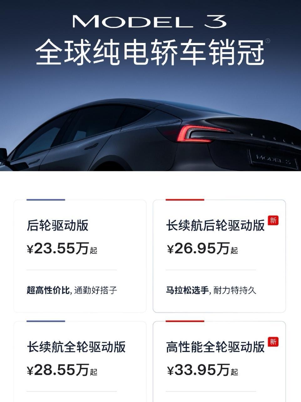 特斯拉Model3可以说是最先感受到国产电车冲击的车型,以稳健著称或者说是高傲者姿态,这下也不得不低下高昂的头颅,开始思变改款了。仅仅这半年时间就上马多款车型,可以说更新速度之快前所未有,近期又历史性的上了后驱长续航版本,可以说在中国市场上求生欲满满。下面就分析一下Model3这几款版型哪一个值得入手。 ◢电池及续航 Model3在售款型一共四个型号,分别为后驱,后驱长续航,长续航全轮驱动和高性能全轮驱动。除了后轮驱动入门版电池是宁德时代62.5kwh磷酸铁锂电池,其它3款都是LG的78.4kwh三元锂圆柱电池,其中后轮长续航比入门版多了16度电池,CLTC多了200km,价格贵了3.4w。相比长续航全轮驱动,少了一个电机,便宜了1.6w。而性能版跟这几款就不是一个类别的车了,调教都不一样,不属于一般的家用轿车,所以这款只适合玩车的人,这里不做细述。 ◢电机及性能 Model3后轮驱动配194kw的电机,马力高达264ps,对于日常代步足够用了。而后轮长续航因为增加了电池容量,车子整体更重。所以电机功率来到了225kw,马力306ps,比model Y后驱标续版还高。所以在增加续航的同时,操控性能并没下降。而双电机车型动力更充沛,同时全驱车在应对复杂路面及激烈驾驶时增加安全。 ☞聊完参数,下面就该聊一下价格和使用场景,具体哪款最值得买呢?首先,model3p,就是给专业或者玩车人士准备的,买这款车就不要在意性价比了,追求的是操控和赛道体验。剩下3款需要根据用车场景来分析。 〇平时上下班通勤,或个人代步,短距离出行,平时用车少,最好有家充桩,这种最适合入门版,不需要很高的续航,每天背着大电池,能耗还高,不划算。 〇平时上下班通勤距离长,周末节假日有长途旅行需求,那就适合长续航了。毕竟特斯拉还是400V平台,没有快充,长途旅行充电补能不方便,有了大电池,可能整个单程都不需要充电,这是很有必要的。而且长续航不仅仅增加了电池度数,电芯也变成三元锂了,电机功率也增加了,总价贵2.4w我觉得很划算。 〇如果再有实力,可以考虑长续航全轮驱动,毕竟四驱在恶劣天气环境和偶发意外情况下操控安全性都更加有保障。 ▼▼▼ model3可以说更新最快的一款车了,因为受到以小米SU7为代表的国产车的冲击,特斯拉有点坐不住了,必须通过改款来刺激销量。不着急的朋友可以再观望一下,我觉得很快就会有价格上的优惠,市场是残酷的,所有产品的竞争力最终还是要反映到价格上,model3价格还有下降空间。