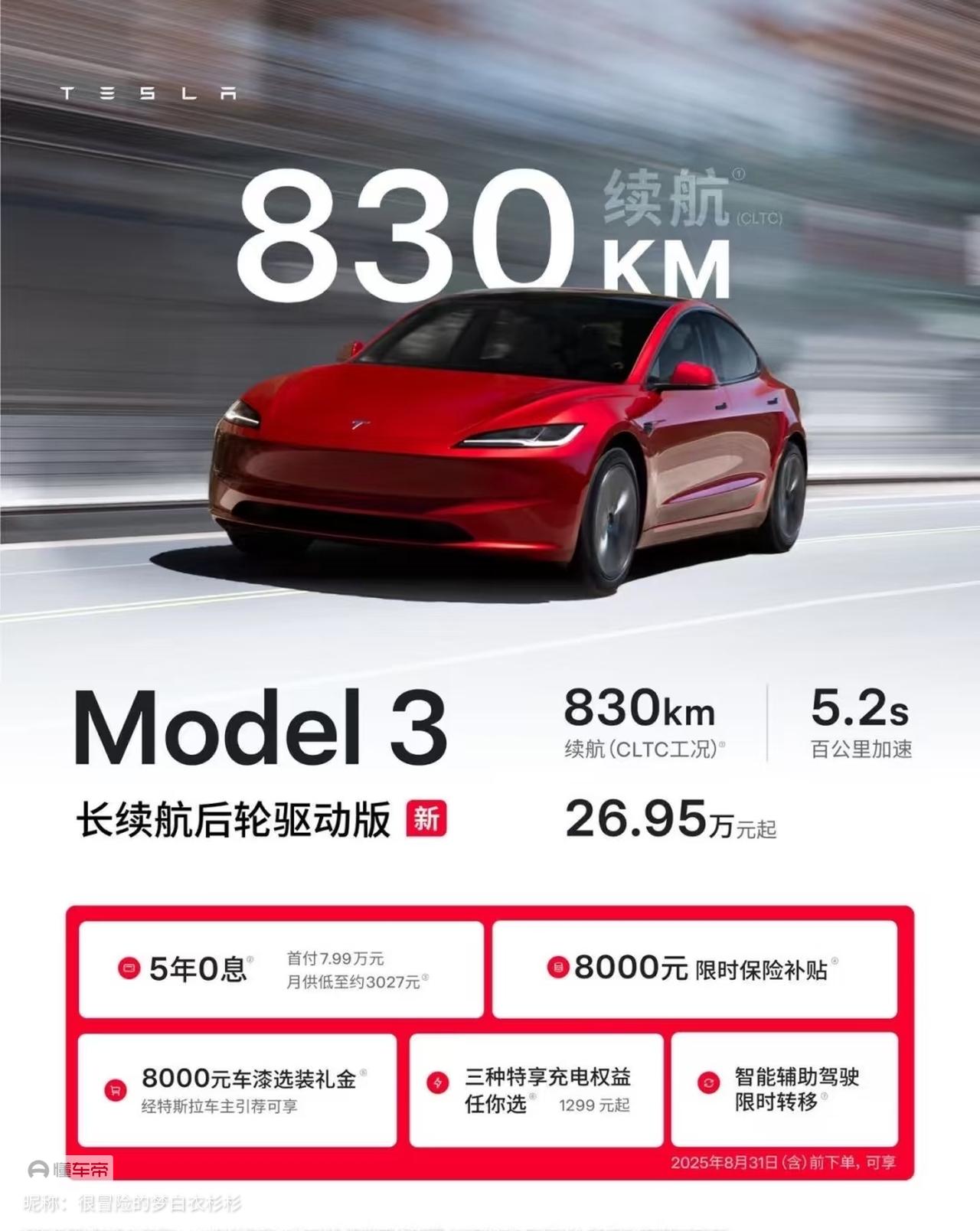 【试驾全新model3】 前两天全新的model3不声不响的上市了,这次续航增加是最大的看点。下面我来谈谈试驾一下全新model3体验吧! 【新款的改变】 ①明显的改版是新款m3 拨杆全取消了,转向灯试驾几分钟就能够适应,因为是机械按键,不是触摸式的,按没按是有感觉的,适应后挺香。 ②换挡改为屏幕换挡,试了个侧方停车,在切换不频繁的路况下是没有适应上的问题,倒车也是和油车一样,脚放在刹车上就行,除非开了动能回收那倒车需要踩油门。 【关于智驾】 ①这次全新的model3智驾基础版是自带,无需额外购买,只能直线行驶; ②智驾第二档3万加,人按下转向灯可以辅助变道,可以自动泊车。 ③智驾第三档6万加,可以根据地图全程接管送到目的地,完全自动驾驶,国内目前还没有。 ④个人觉得智驾即使使用频率不高,但是得有,但是可以观察后期是否降价。 【缺点分析】 ①这次新款model3自重算轻的,底盘调校不如之前,试了下快速变道和弯道行驶,车身没有多余的晃动,但是侧倾比较大。 ②避震效果不算好,满分10分,model3的避震可能只能打3分,坑坑洼洼的路会颠晕,很晃像开船一样。 ③刹车非常硬,算是我踩过的很硬的车型,感觉不太舒服。 ④内饰上确实是毛坯房了,前排仅有的一块屏幕和两个无线充电位,无其他情绪价值,音响也就正常水平。这个价位配置算比较低了。 【优点分享】】 ①最明显的感受就是整体舒适度大幅提升,长时间开起来不累,坐起来很舒服。 ②座椅舒适性也提升很多,支撑性和包裹性可能下降了但是舒服太多,而且增加了座椅通风功能。这点配置提升了。 ③隔音表现好了太多,现在跑高速比较明显的只剩下一些路噪和胎噪,风噪控制的明显要比老款好得多。 ④电耗相当优秀了,日常驾驶平均能做到13.5度/百公里的电耗,真的相当出色而且并没有刻意去省着电开,空调正常开,该加速加速。电耗在新能源汽车算是非常低了。我看有的车友电耗才9度/百公里。 【试驾完总结】 整体来说全新Model 3相比老款还是有着大幅提升,起码过去一提起特斯拉3和Y真的是非常抗拒,不想开更不想坐,但开过新Model 3之后确实有所改观,配置我推荐大家买长续航后驱版830公里那一款。续航扎实,电耗低。