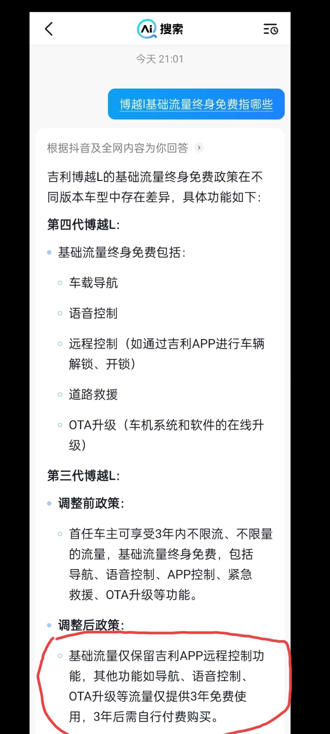 购车时承诺基础流量终身免费包含地图导航、软件升级、远程控制、道路救援、智能语音、数据同步上报等现在被厂家私自改成了基础流量只有远程控制其他全不包含了!吉利博越L,厂家篡改车机流量,基础流量使车用范围。如果是那些听歌,视频,哪怕车载导质航娱乐流量都可以接受。本身车机就没有实体网按键,连语音助手都算娱乐流量,干脆别用好了,厂家这吃相太难看了。要是开高速的时候我还得手动在车机上点点点,出事了连SOS都算娱乐流量,这是不把人命当回事的草菅人命。 私自篡改基础流量规则,不讲信用自砸招牌,作为车企,这点蝇头小利都不放过,种种迹象表明当初选择吉利是个错误的决定。