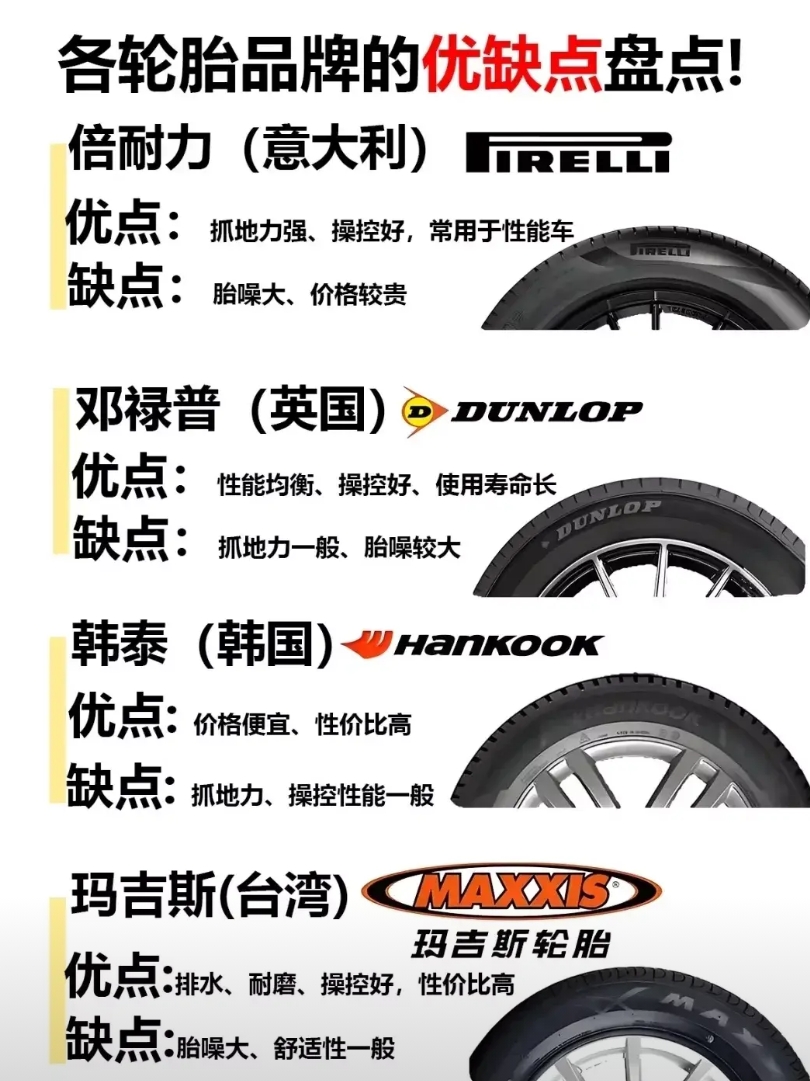 家人们!轮胎界“神仙打架”优缺点全曝光!米其林静音稳如老狗但不耐磨,固特异越野猛却吵得头疼,普利司通均衡却胎噪大… 从倍耐力到玲珑,各品牌优缺点扒得底朝天,换胎纠结症直接治好! 这么全的轮胎干货,车迷们不收藏等啥?