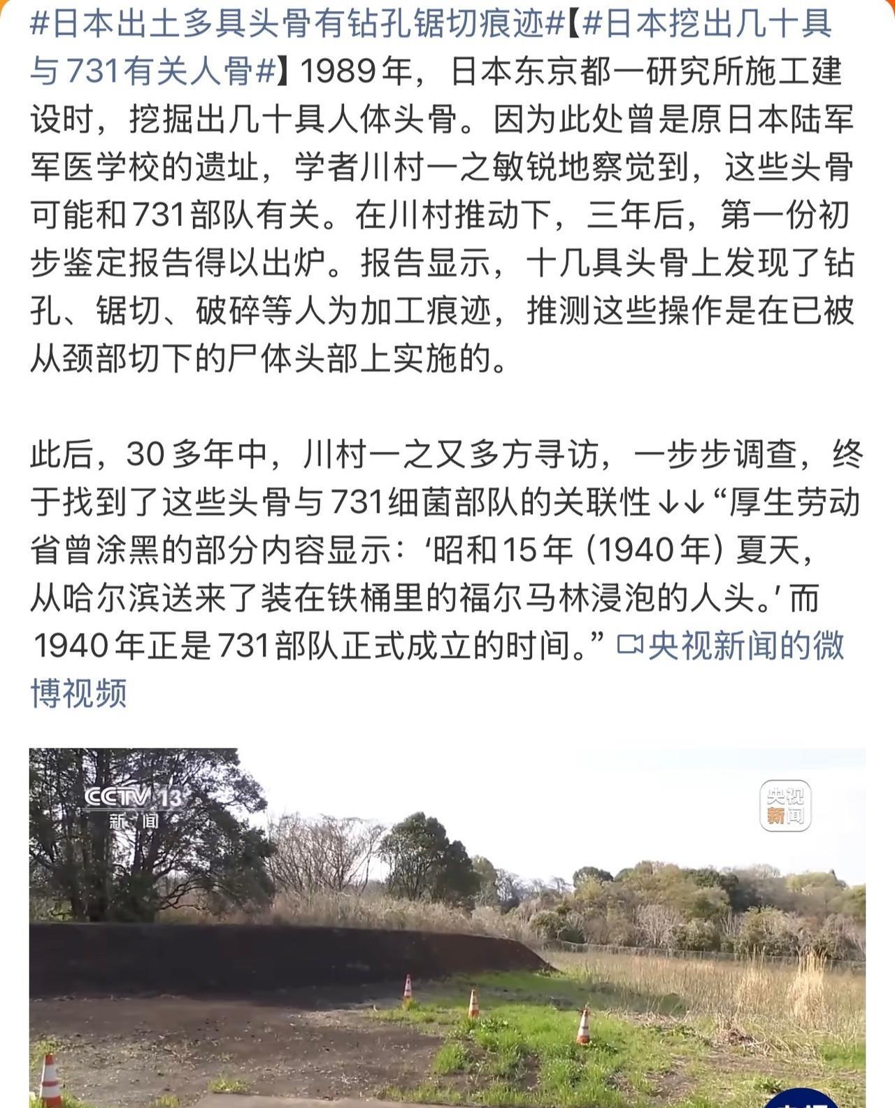 日本出土多具头骨有钻孔锯切痕迹 学者发现:“这是1940年夏天从哈尔滨送来了装在铁桶里的福尔马林浸泡的人头。而1940年正是731部队正式成立的时间。” 哪怕无数历史罪证浮现,但依然有懦夫选择闭眼否认,不敢直视历史。但历史永远不会被谎言掩盖,也不会被遗忘!