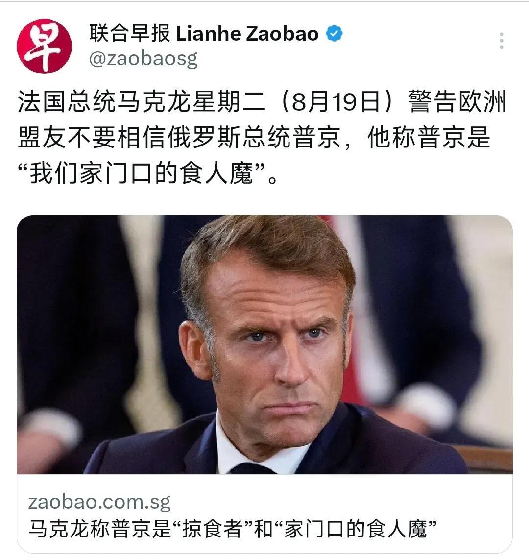 新加坡联合早报昨晚(8月19日)报道:“法国总统马克龙星期二(8月19日)警告欧洲盟友不要相信俄罗斯总统普京,他称普京是‘我们家门口的食人魔’。” 就像欧洲不再相信自奉的“欧洲领导人”一样,法国这两年总是“嘴炮过剩,援乌退后”,德国半年内援乌近150亿美元,法国呢?除了嘴炮还是嘴炮。马克龙称“法国已经倾尽所有,对乌援助已到极限”,靠喊口号只能让乌克兰领土越来越少,人员伤亡越来越多。