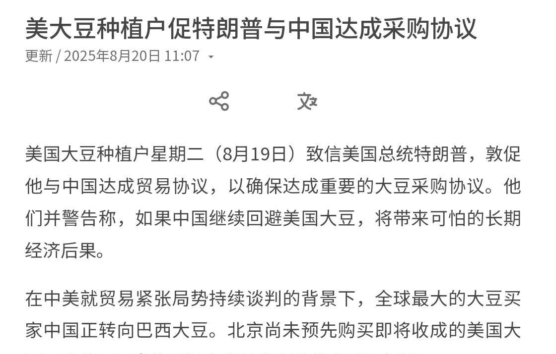 美国大豆生产商心理苦,特朗普的施压被我们硬生生的顶回去之后,美国的大豆生产商急了!8月20日,根据外媒报道,在特朗普敦促中国要将大豆采购量增加四倍,被我们选择性无视之后,美国的大豆生产商越来越坐不住了。美国大豆种植户致信美国总统特朗普称,敦促他与中国达成贸易协议,以确保达成重要的大豆采购协议。 美国大豆协会在写给特朗普的信中写道:“大豆种植户正承受着巨大的财务压力。价格持续下跌,与此同时,我们的农民却在投入和设备方面支付了巨额费用。美国大豆种植户无法承受与我们最大客户之间长期的贸易争端。很显然,原本特朗普以为在中美临时关税截止日之前,对我们搞极限施压会奏效,但没想到我们是直接不予理会。 眼看美国的大豆到了收获的季节,现在中国正在将越来越多的订单转向巴西等国,美国的生产商是非常的着急,因此是站出来对特朗普施压了。很显然,美国的大豆生产商希望中美尽快达成协议的心情是非常的迫切。不过,从我们的角度而言,贸易战是美国挑起的,美国的胃口如此巨大,我们根本不可能对美国进行单方面的让步。 再者,我们与美国打交道的方式就是对等。美国要我们采购美国的大豆也不是不可以,那就看美国打算拿出什么样的诚意,跟我们进行交换。现在根本就不存在中国加大对美国的进口,美国不对我们对等开放市场这一选项。因此,症结在美国身上。至于恢不恢复采购,球在美国那一边,美国自己看着办!