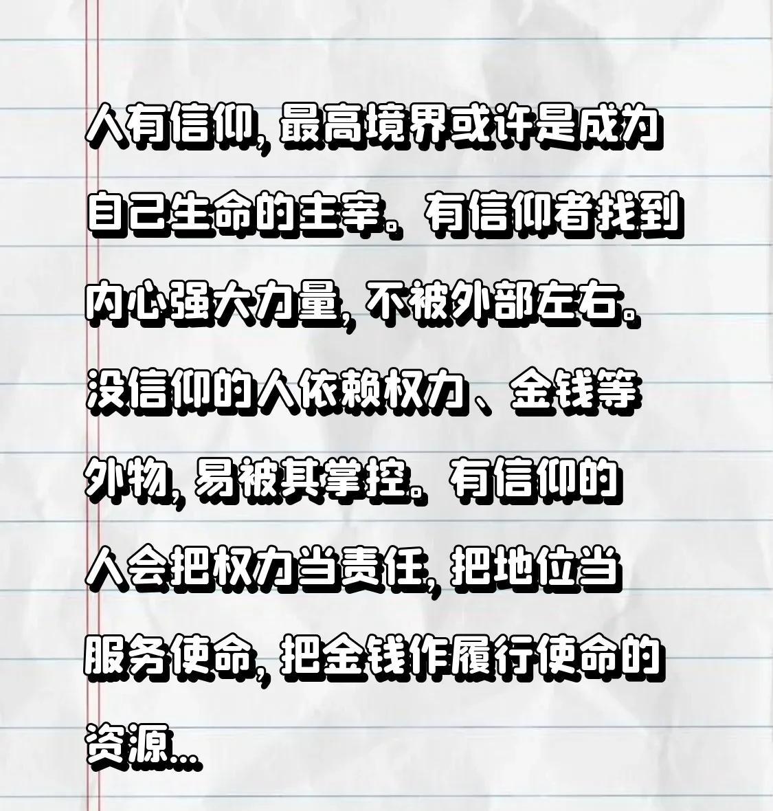 人有信仰,最高境界或许是成为自己生命的主宰。有信仰者找到内心强大力量,不被外部左右。没信仰的人依赖权力、金钱等外物,易被其掌控。 有信仰的人会把权力当责任,把地位当服务使命,把金钱作履行使命的资源。他们视诱惑为考验,把困难当提升机会。而且,唯有信仰能保证利益长久,不会在利益面前一味计较。信仰让人超脱,以自然规律为准则,这或许就是信仰的至高境界。