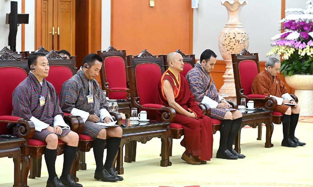 苏林会见不丹国王吉格梅,从现场可以看到不丹的服饰很有特色,男性统一短裙长筒袜,而且坐姿也很有讲究。他们在做记录时,几乎就是一张纸,有的神情肃穆就在旁听,而且还有高僧在座,实际上,不丹的佛教非常发达,这也是不丹高僧参加和苏林座谈的原因所在。