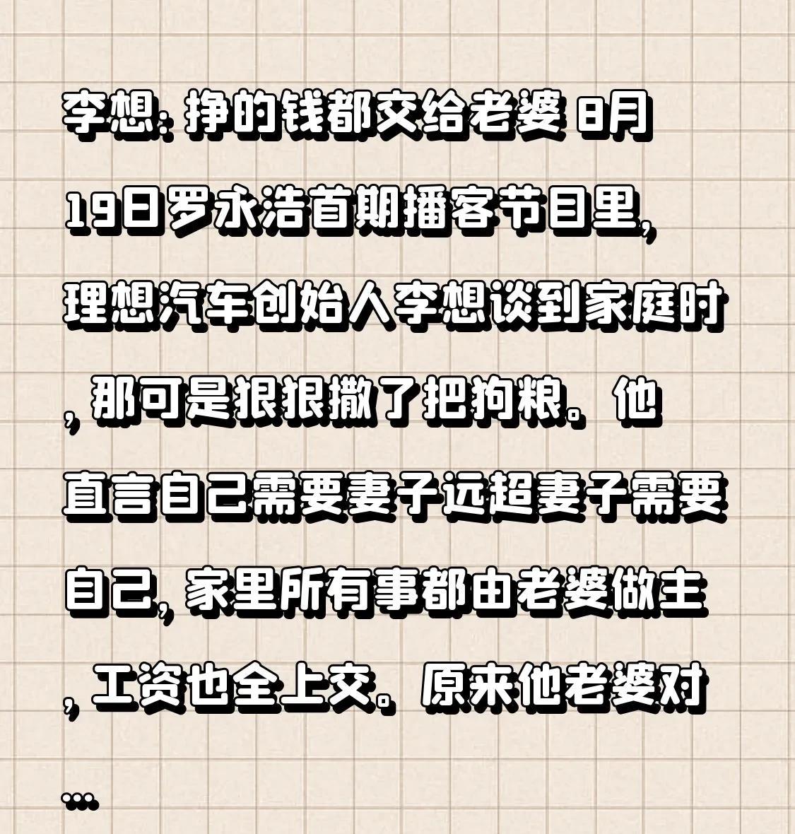李想:挣的钱都交给老婆李想:挣的钱都交给老婆 在8月19日罗永浩首期播客节目里