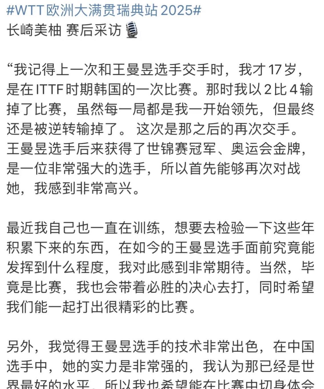 王曼昱与长崎美柚的头对头全记录 WTT瑞典大满贯 女单1/8决赛 8月21日 王曼昱VS长崎美柚 瑞典大满贯1/16决赛中 长崎美柚3:1考芙曼 ,晋级16强! 王曼昱3:0迪亚兹晋级16强! 从以往的交手记录来看, 2019年和2023年王曼昱与长崎 的战绩保持在两战全胜, 但这么长时间没有再次交手, 属于遭遇战, 长崎美柚最近涨球了, 因为她想拼一个洛杉矶奥运会名额! 王曼昱也不是原来的曼昱, 技术方面也有创新! 曼昱特别要小心她的高抛发球, 相信曼昱,加油! 长崎在赛后的采访中展望与王曼昱的 比赛,带着必胜的信念, 努力去拼,希望能与曼昱学到东西! 加油曼昱!