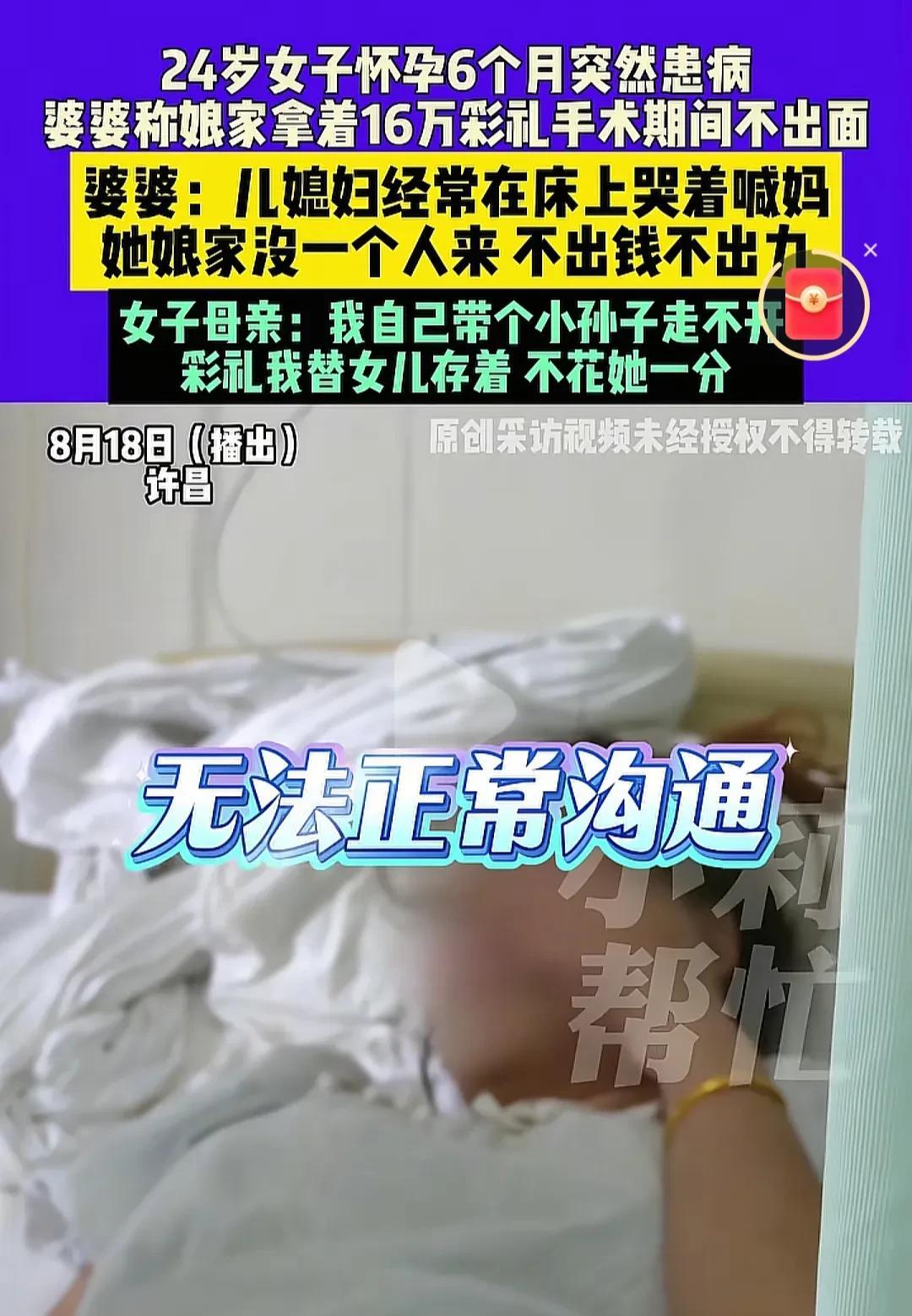 女儿病重,娘家妈握着16万彩礼,手术前后不出面,女儿在病床上哭喊想妈。女子母亲说带小孙子走不开,彩礼会替女儿存着,不花她一分。 许昌的贺女士称,儿子与儿媳认识不到一年,今年4月份结婚,当时己怀孕近3个月,7月份时儿媳突然患病往院治疗,医生说胎儿保不住,8月初做了引产手术。 贺女士说,当时儿媳手抖擞咬牙,到现在也没查出什么病,家里花了七八万了,而儿媳的娘家妈握着他家给的16万彩礼不出一分,儿媳手术前后娘家没一个人来看,不出钱也不出力。儿媳经常躺床上哭喊娘,”恁娘是真狠的心呐,不来看看俺。” 真是有了儿,女儿的命就是草。儿媳的娘家妈听记者说女儿责怪她不去看望,没有一丝难过,反而还挺气愤,“她动不动说俺坏良心,早知道这样我不要她了。” 看来这妈对女儿一直不好,女儿心里跟明镜似的,母亲不仅不反省,还说不该养这个女儿,大抵是没觉得没价值了。 当记者问娘家妈,16万元的彩礼钱是不是在你手上?你为什么一分都不拿出来救女儿的命。 娘家妈说钱在她手上,给女儿保存着,一分也不会动。 女儿病重,救命都不拿出来,更待何时?病重前后不管不顾不看,会为女儿着想谁也不会信。 当被问到,女儿病重,为什么不去看望下女儿? 娘家妈说,她要带小孙子走不开,其实她也挺担心,吃不下去,走也走不动。 后来是在记者的劝说下,娘家妈才答应,有空再去医院看看女儿,关于彩礼支付部分医疗费问题,会跟女儿婆家协商。 这大概就是女人口中的,女人一旦有了兄弟,就没了家,嫁出去的女儿,泼出去的水,但独生女就不一样。 我小区的一家儿媳结婚没一年得了脑瘤,还没孩子,双方是独生子女。婆家在当地医院尽力治,但得知病情严重时,娘家父母拿出全部积蓄将女儿转到省医院动手术,出院后娘家妈担心婆家照顾不周,接回娘家调养,现在孩子好几岁了,过得挺幸福。 所以,女孩子嫁人后,如果娘家条件一般,还有兄弟,娘家大抵是靠不位的,父母也作不了主了,女孩得有点保命心肝,好好经营自己的小家,与婆家和睦相处,在婆家的帮助下,过好自己的日子。