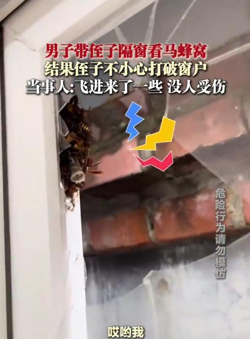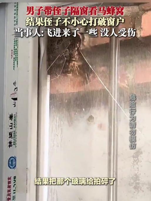 太惊险了!北京,男子带侄子隔窗看马蜂窝,不料,小孩子好奇,用衣架去敲玻璃,一下竟然不小心打破窗户,虽然一些马蜂费劲物理,但幸好没有人受伤,可想到当时的场景,男子还是后怕不已 男子介绍,当天8岁的侄子来家里,看到窗户外的马蜂窝,就觉得很好奇,他也没当回事,就跟着侄子一起隔窗看马蜂窝 本来只是隔着窗户指指点点,谁想到孩子一调皮,抄起衣架就朝玻璃敲,啪嚓一声,窗户连带纱窗全碎了,马蜂瞬间涌进来好几只,大人孩子吓得扭头就跑。幸好人都没事,但事后回想,谁都一身冷汗 两个人连忙就跑出屋,好在没有伤到人,后来他捣掉了外面的马蜂窝,但很快马蜂又重新回来筑巢了 不得不说,小孩子面对陌生事物的时候,胆子往往比大人想象的要大,他们不知道危险在哪,反而觉得是游戏。大人要是掉以轻心,很可能就出意外,好在最后是虚惊一场 说起来,马蜂这种昆虫其实有很强的领地意识,而且马蜂有归巢习性,如果只是简单捅掉而没有清理残留气味或者封锁筑巢点,它们很可能再次回来 最好还是联系消防或专业防治机构处理,自己动手风险太高,它们能在短时间里重新筑巢,这说明一旦你家窗外或屋檐下有了蜂窝,光靠打掉一次是不解决根本问题的,得从源头清理干净,必要的时候还得请专业人员处理