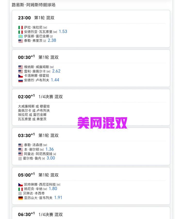 今晚轻松又养眼的美网混双来咯!! 8月19日23:00第一轮 大坂组合vs穆塞蒂组合 埃拉尼组合vs莱巴组合 8月20日0:30第一轮 丝袜组合vs凯斯组合 大威组合vs火娃组合 8月20日3:30第一轮 佩古拉组合vs阿卡组合 谢尔顿组合vs鲁内组合 8月20日5:00第一轮 德约组合vs梅总组合 辛纳组合vs紫薇组合 半决赛: 8月20日2:00两场半决赛 8月20日6:30两场半决赛 还有美网单打资格赛也在同时进行,韦思佳、张帅、吴易昺都将登场,克利夫兰郑赛赛和朱琳搭档双打,哈哈、太多比赛了,完全看不过来!!#网球# #美网混双# #美网公并赛#