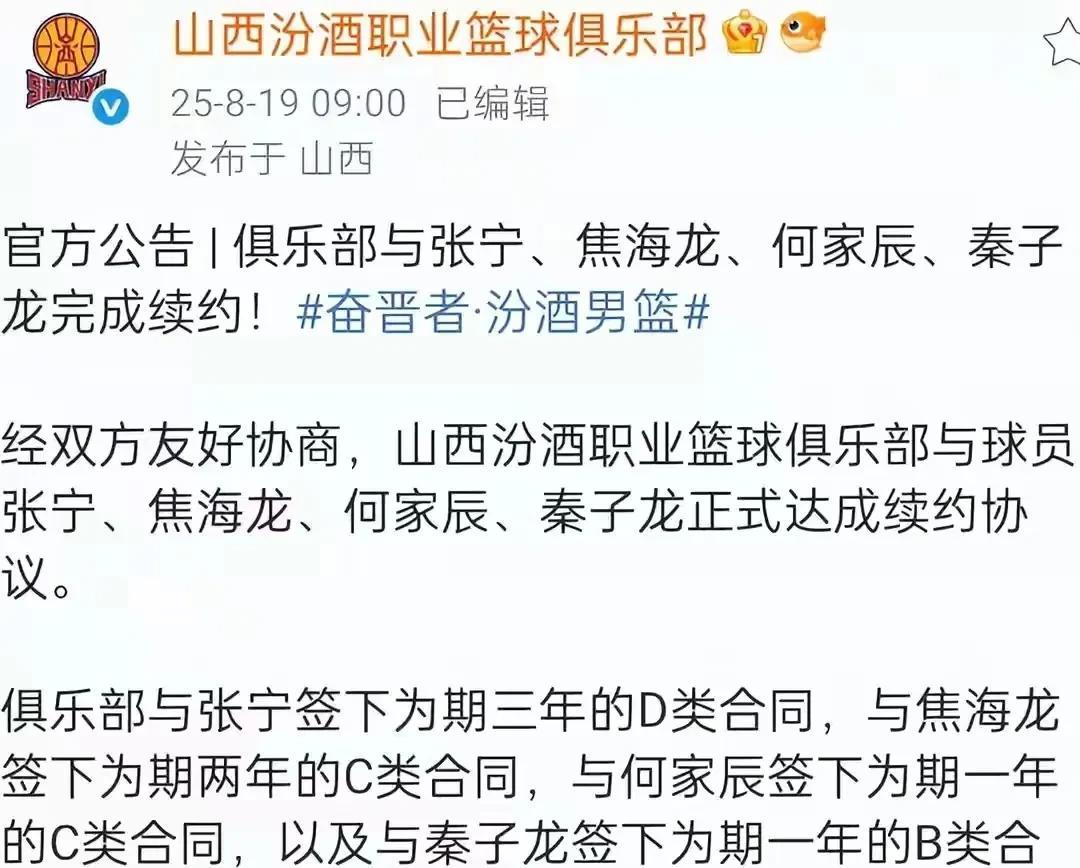 潘江乐了! 山西官宣D类三年合同续约张宁。张宁发文感谢山西体现了职业球员的清醒认