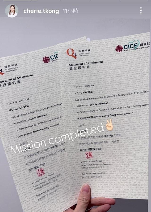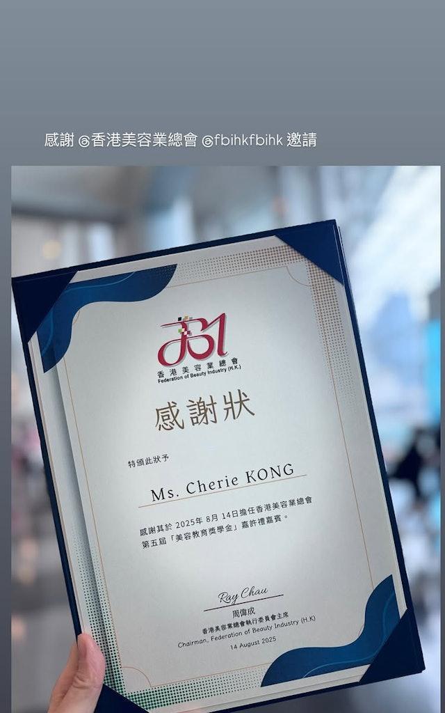 现年48岁的江芷妮(Cherie)2007年约满TVB离巢后退出娱乐圈,并转行从商开美容院做老板,同时她亦继续进修,除了在香港大学修毕工商管理硕士学位之外,早前她就透露获得美容业资历认可4级资格,日前她更以职业训练局美容及美发业训练委员会主席的身份,出席博览会,并担任颁奖嘉宾! 江芷妮在IG限时动态分享照片,相中所见,一身知性Look的江芷妮冻龄有术,气质依然,她在台上分享自身经验,又担任「美容教育奖学金」嘉许礼嘉宾,并获颁感谢状。江芷妮曾赴美国及日本留学,当年陪朋友面试港姐被发掘,2001年加入TVB,初时担任《非常音乐空间》、《K-100》主持工作等,经常被指与唐诗咏撞样,她亦有拍摄剧集,包括《同捞同煲》、《爱情全保》等,与马国明曾是萤幕情侣。不过江芷妮在2007年约满后离巢,并用在《万千星辉贺台庆2007》中赢得的价值100万港元的现金奖,以及多年来参与游戏节目所赢得的30多万港元奖金作成本,成立自己的美容集团。 2012年江芷妮与建筑师男友结婚,婚后育有一对仔女,一家四口幸福美满。转型成功的江芷妮,事业上了轨道,不时出席美容业界会议,又会出埠视察,更亲身上阵介绍自家产品,做埋生招牌,而48岁的她更保养得宜,皮肤仍白滑紧致,状态Fit爆!