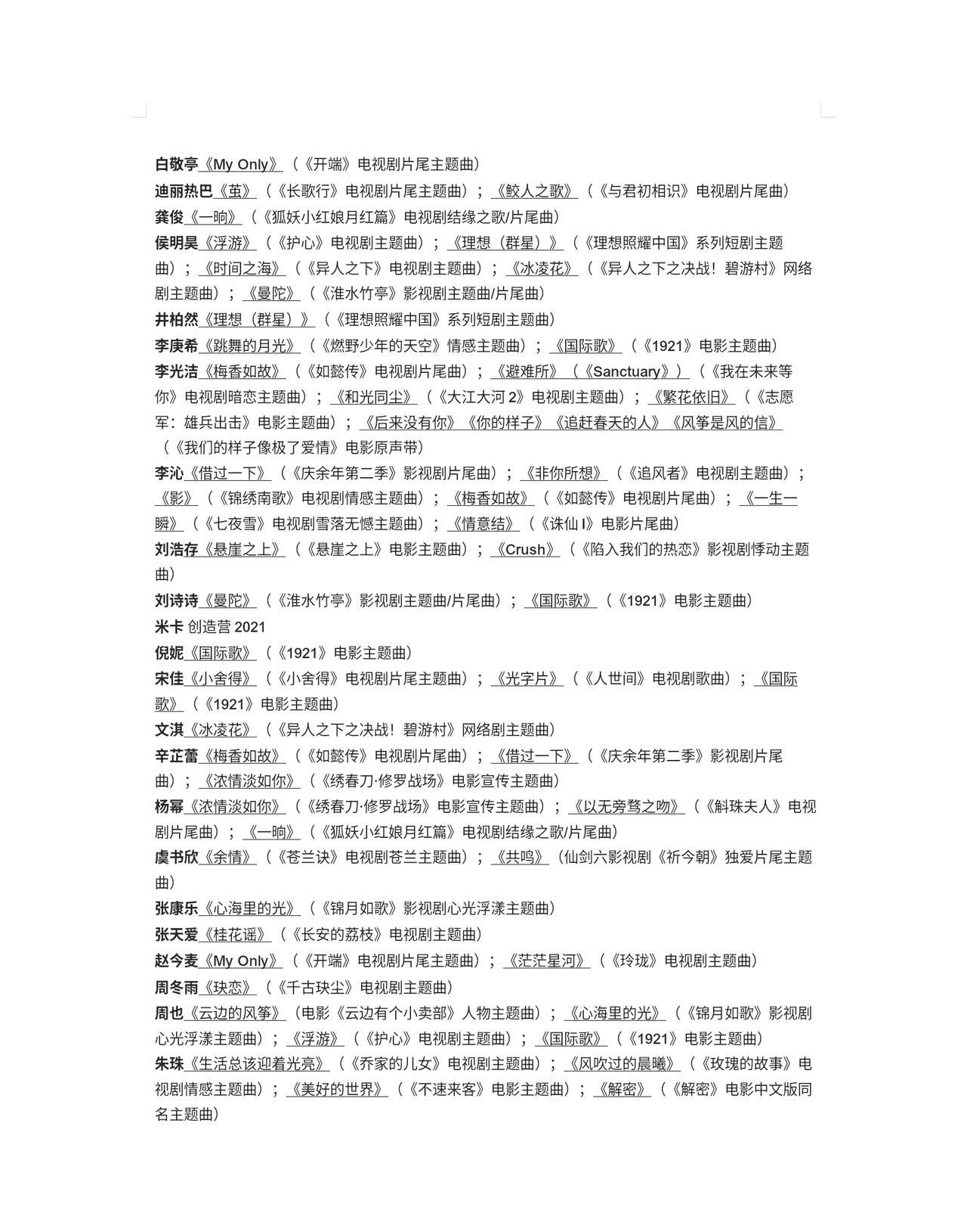 周深一首歌路过大半个内娱! 好权威的一组图!不愧是OST大魔王! 在W年度光影盛典中,周深用自己二专歌曲《嗨》和自己唱过的男女主打招呼! 李沁的有:《影》《借过一下》《一生一瞬》《非你所想》 虞书欣有:《苍兰诀》里面的《余情》,还有《共呜》 李光洁有:《繁华依旧》、《和光同尘》 朱珠:《风吹过的晨曦》《解密》《生活总该迎着光亮》 张康乐有:《心海里的光》 迪丽热巴有:《鲛人之歌》,《茧》 PS:补一张比较完整的文字版 #周深#