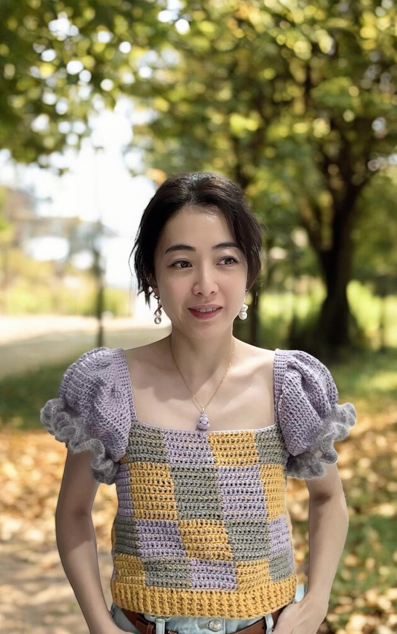 8月20日,甘比晒日常生活照,她脸上的微笑,给人一种知足常乐的感觉。 甘比身穿一件针织拼色毛衣,短袖是木耳边和灯笼袖的设计,还有四方领口和露脐的设计,这都是她自己钩织出来的。#甘比# #甘比穿搭#