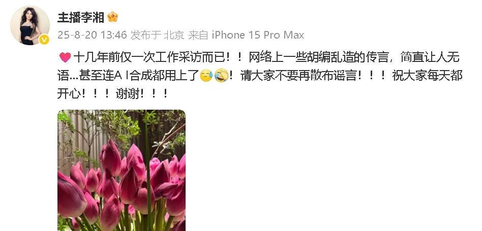 李湘终于回应与释永信的过往。 根据李湘文中所说,她跟释永信只是十几年前仅一次工作采访而已,其他的并没有什么交集。 同时,李湘也对网络上的传言,甚至是ai制作,感到无语。 释永信出事后,一些人针对李湘的巨额财富与之联系起来,凭空揣测。 甚至有的人认为王诗龄的长相与释永信很像,让人浮想联翩。 虽然李湘平时不断的炫富,如大姐大驾到不讨喜,但与释永信的传言未免太离谱。 希望谣言止于智者,大家不要以讹传讹。