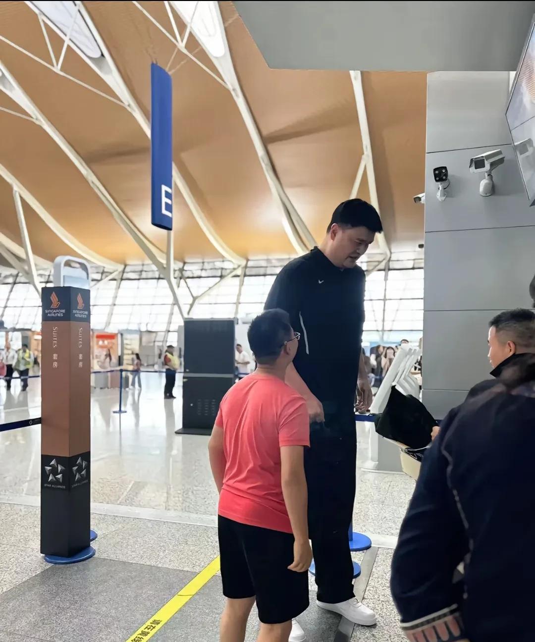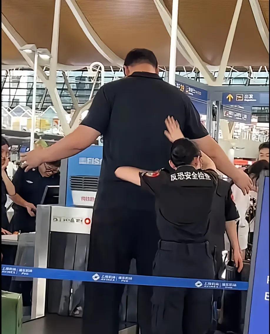 难得一见姚明过机场安检的画面! 只见他站在安检口,一个安检小姐姐用手在他后背,口