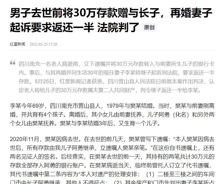 四川一大爷,临终前留下遗嘱,把30万给了和前妻生的儿子,和他共同生活30年的再婚