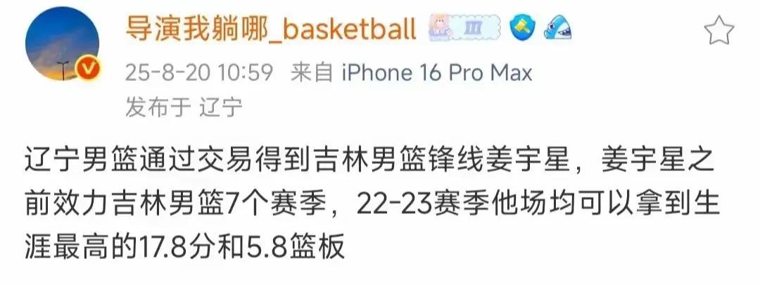 杨鸣一鸣惊人! 8月20日,CBA转会市场迎来重量级交易:辽宁男篮与吉林男篮完交易转会,辽宁队成功引进吉林锋线核心姜宇星,这笔交易对于辽宁冲击新赛季冠军的关键布局。 根据辽宁媒体人透露:确辽宁队为得到姜宇星也付出足够筹码:锋线球员赵率舟正式转会吉林,同时附加部分现金补偿,潜力内线刘雁宇则以三年租借形式加盟吉林,形成“球员+资金+潜力股”的组合交易方案。体现出辽宁队对于姜宇星能力的高度认可。 姜宇星身高1米94,司职锋线,过去七个赛季在吉林队,凭借攻防两端的全面表现多次入选全明星阵容与联赛最佳阵容。上赛季因伤病仅出战7场,仍交出场均12.7分、3.7篮板、2助攻、1.1抢断的亮眼数据,杨鸣看中其强悍的突破能力与防守韧性正是辽宁队锋线急需的补充。此次交易既强化了辽宁的争冠拼图,也为吉林队带来即战力与未来储备,堪称双赢之举。