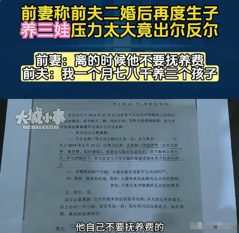 重庆,男子离婚后,跟前妻约定,女儿归他抚养,前妻不用出任何费用,可之后男子再婚,娶二婚带孩子的女子为妻,跟妻子又生了一个孩子,生活压力大,他要求前妻支付孩子的抚养费。可前妻却说:这一切不是我造成的,我们是签了协议的,我不会给抚养费,就算要给,也不是2、3万的给,你得把凭证拿出来。