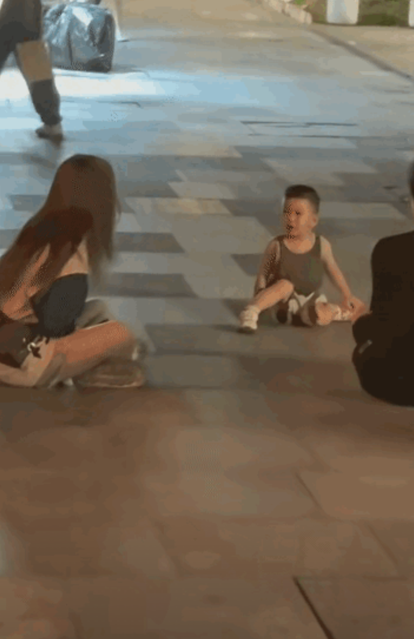 这时,两个路过的年轻小姐姐却停下了脚步,她们相视一笑,竟一左一右坐在小男孩身边,也跟着“哇哇”大哭起来!