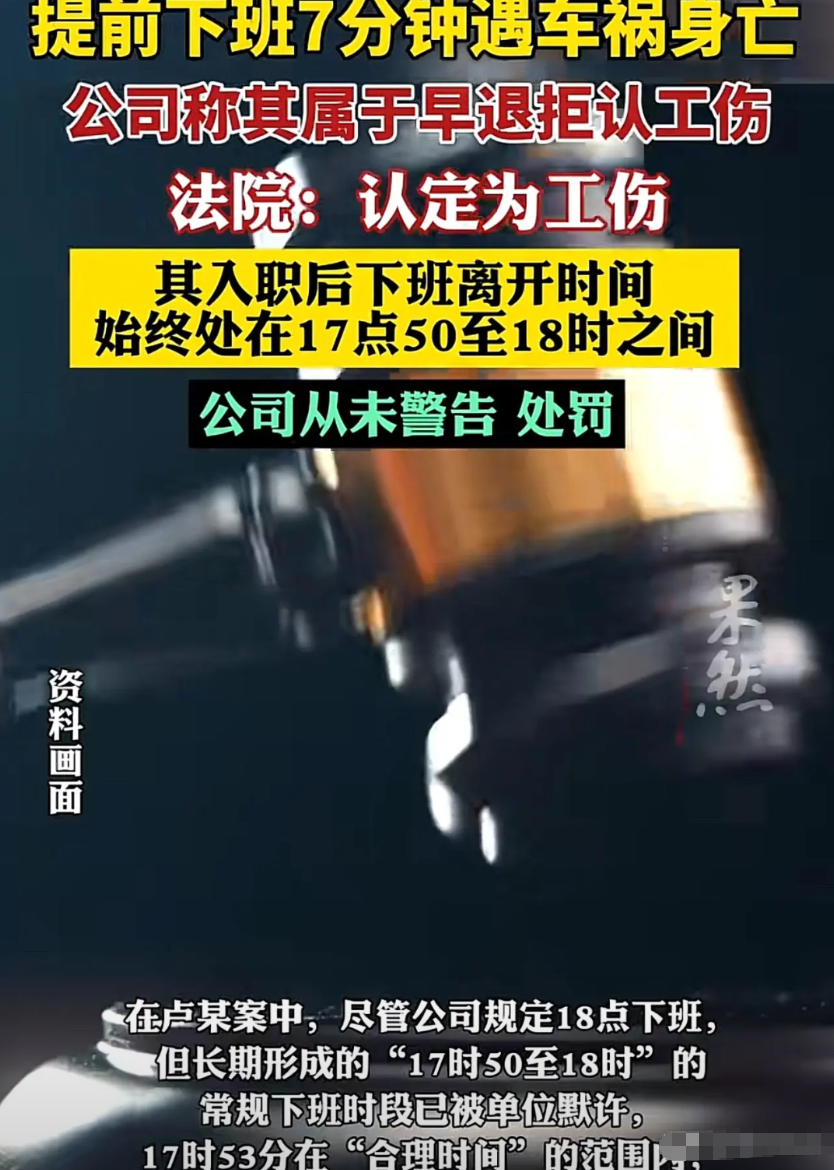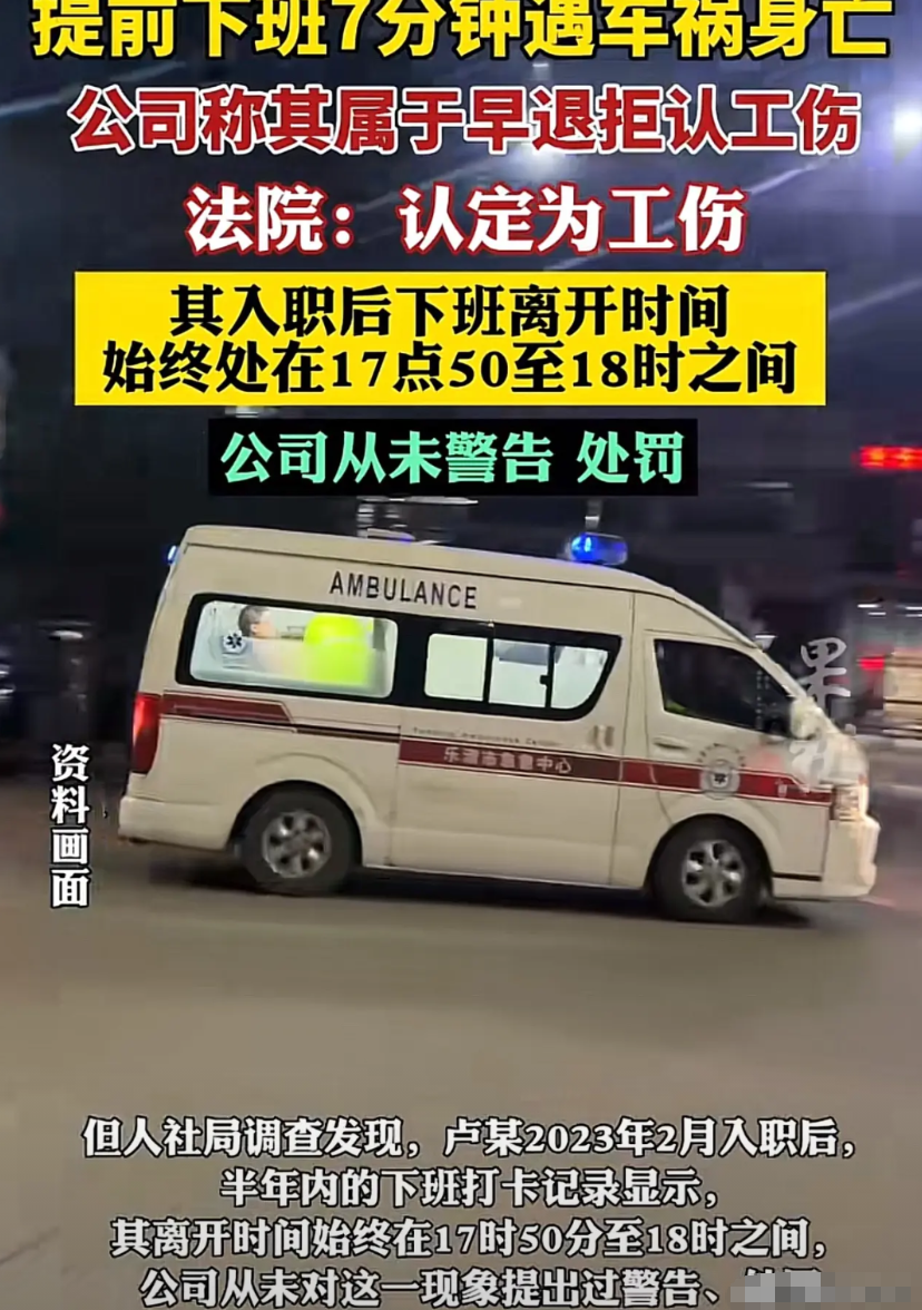 处理完后事,家属向当地人社局申请工伤认定,公司却跳出来反对,称规定下午6点下班,卢某5点53分离开属于私自早退,不能算正常上下班,因此不能认定为工伤。