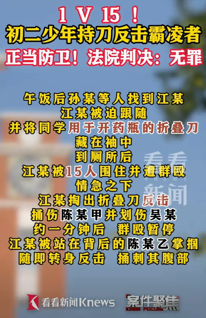 法庭上,小江及其辩护人认为,小江在遭受多达15名同学的霸 凌时,实施防卫行为,对不法侵害人造成损害,属于正当防卫,不应负刑事责任。