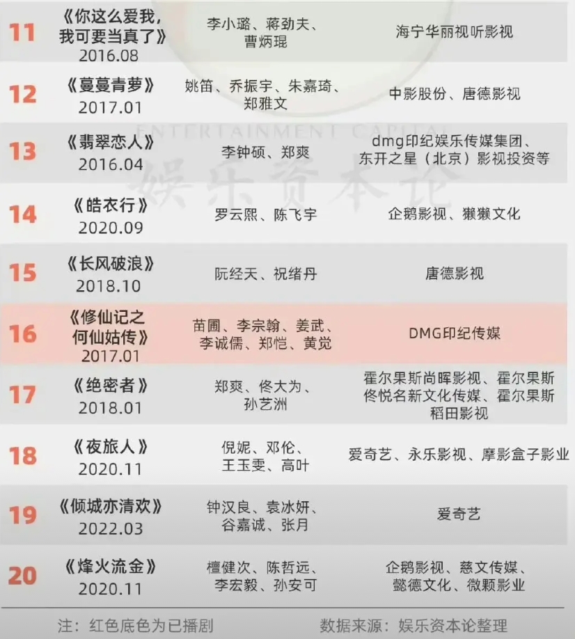 另外积压剧最多的就属郑爽了,光是这个榜单里就有三部。