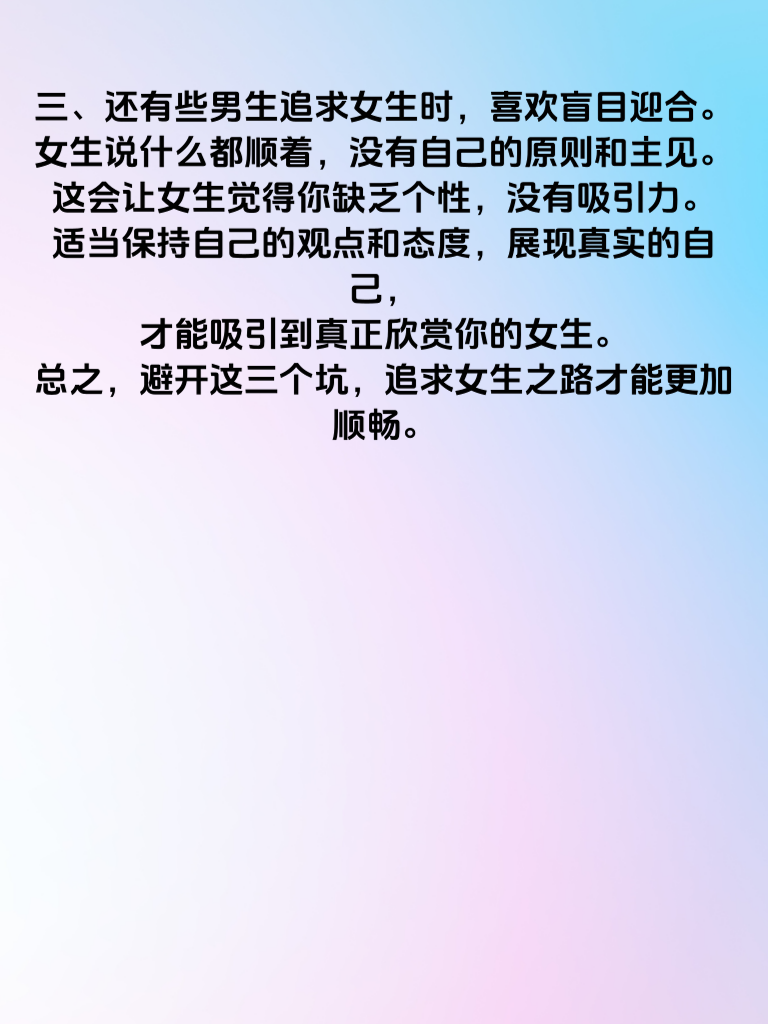 一、追求女生时,第一个大坑就是过度急切。有些男生刚认识女生不久,就迫不及待地表白,或者频繁追问两人关系。这会让女生感到巨大压力,她还没足够了解你,就被你逼得太紧,很可能直接对你产生反感。追求是一场马拉松,不是百米冲刺,要给彼此时间去熟悉、去适应。 二、不懂倾听也是常见的错误。很多男生在和女生交流时,只想着展示自己,却忽略了女生的想法。女生说话时,要认真倾听,给予回应,让她感受到被尊重。只有这样,她才会更愿意和你深入交流,增进彼此感情。 三、还有些男生追求女生时,喜欢盲目迎合。女生说什么都顺着,没有自己的原则和主见。这会让女生觉得你缺乏个性,没有吸引力。适当保持自己的观点和态度,展现真实的自己,才能吸引到真正欣赏你的女生。总之,避开这三个坑,追求女生之路才能更加顺畅。