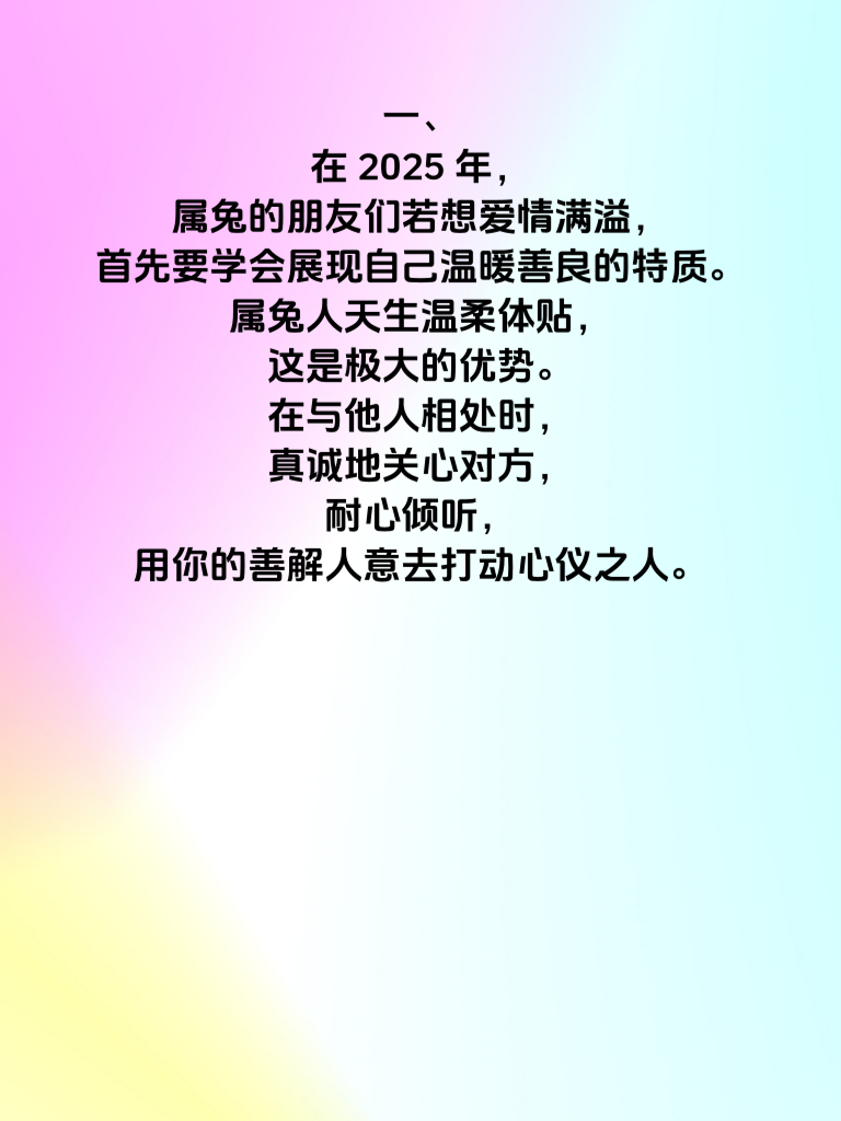 一、在2025年,属兔的朋友们若想爱情满溢,首先要学会展现自己温暖善良的特质。属兔人天生温柔体贴,这是极大的优势。在与他人相处时,真诚地关心对方,耐心倾听,用你的善解人意去打动心仪之人。 二、积极拓展社交圈子也很关键。走出舒适区,参加各类兴趣活动、聚会等。在新的环境中,更容易遇到那个与你灵魂契合的人。说不定在一场艺术展览或者户外运动中,爱情就悄然降临。 三、提升自身魅力不容忽视。保持良好的形象,注重仪表整洁得体。同时,不断丰富自己的内涵,多读书、学习新技能,让自己在交流中更有深度和广度,吸引对方目光。 四、对待感情要保持真诚和专注。一旦遇到心动之人,就全心全意投入。用真心去对待每一个相处细节,让对方感受到你满满的爱意与诚意,如此,爱情满溢的美好愿景定能实现。