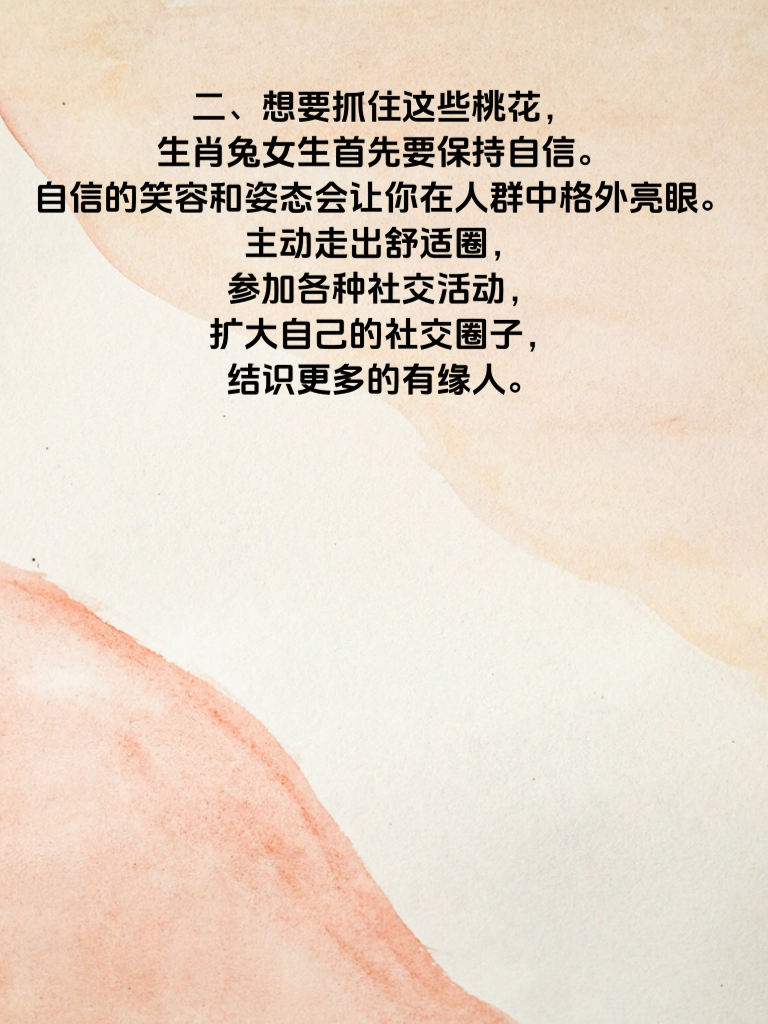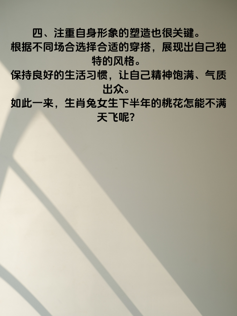 一、生肖兔的下半年可谓是桃花朵朵开!对于生肖兔的女生来说,这是一段充满浪漫机遇的时光。她们温柔善良,本就自带吸引他人的魅力,下半年更是将这份魅力无限放大。 二、想要抓住这些桃花,生肖兔女生首先要保持自信。自信的笑容和姿态会让你在人群中格外亮眼。主动走出舒适圈,参加各种社交活动,扩大自己的社交圈子,结识更多的有缘人。 三、在与人交往中,发挥你细腻体贴的优势。用心倾听对方的话语,适时给予关心和支持。比如,当对方遇到困难时,送上温暖的安慰和切实可行的建议。 四、注重自身形象的塑造也很关键。根据不同场合选择合适的穿搭,展现出自己独特的风格。保持良好的生活习惯,让自己精神饱满、气质出众。如此一来,生肖兔女生下半年的桃花怎能不满天飞呢?