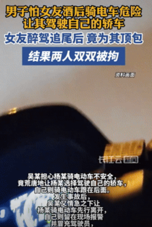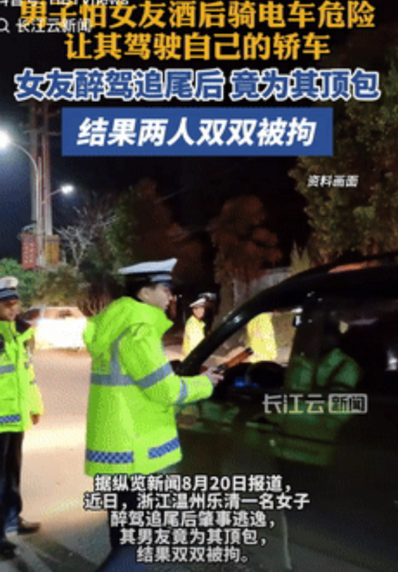 有卧龙之处必有凤雏!浙江温州,一男子怕醉酒女友骑车会出意外,就让她开自己的车,然而,路上女友却不慎追尾,谁料,男子随后的一个举动,成功使自己和女友双双被拘!网友:医学现在发达了,啥胎都能保住! 据长江云新闻8月20日的报道,女友和朋友吃饭时,喝了好几瓶啤酒,等散场时脑袋就晕乎乎的,给男子说了后,他就开着车过去接她。 不过要是让女友坐车的话,那么电动车就没骑了,后备箱也不太能塞下,但让女友骑的话,有些过于危险了。 所以经过一番思考后,就决定让女友开车,自己则骑着电驴在后面跟着,谁料,路上却发生了意外,女友不慎追尾了别人。 因为她喝了酒的缘故,要是被交警发现后,可不仅仅只是要扣分罚款了,说不定还要蹲几年大牢。 而为了避免这种情况,他就先让女友骑车回家,自己则留在原地顶包司机,不过在面对交警的询问时,就因扛不住压力,露出了马脚。 最终他如实交代了一切,就这样,一个因危险驾驶坐牢,一个因提供虚假证言,外加妨碍公务,双双被拘,明明打个车就能解决的,非要闹成这种结局,实在是太不值得了。 所以说,作为一个成年人,做决定的时候必须要考虑好后果,尤其是法律的底线,那是绝对不能触碰的。 那么对于这件事情,您有什么想说的呢?