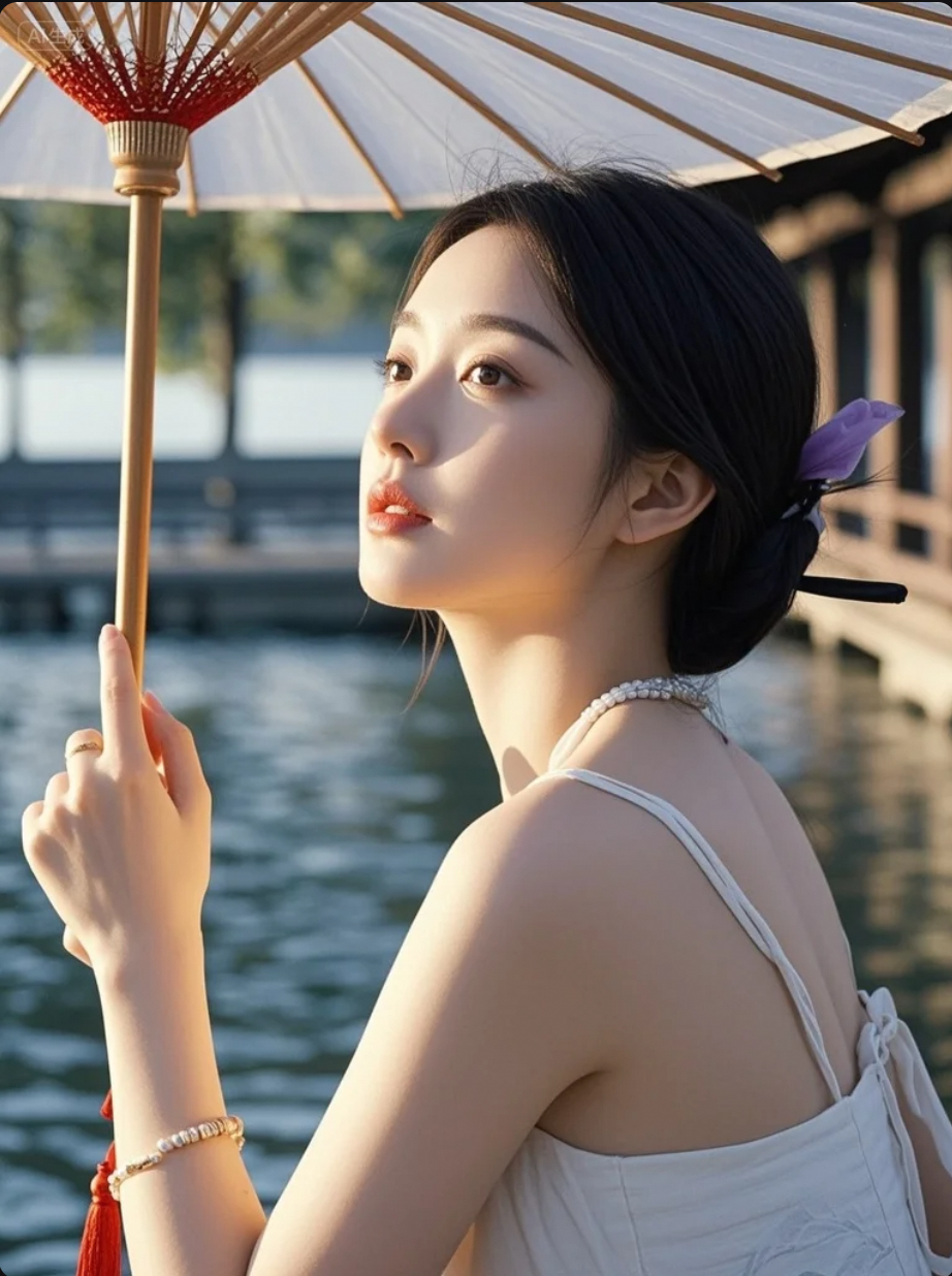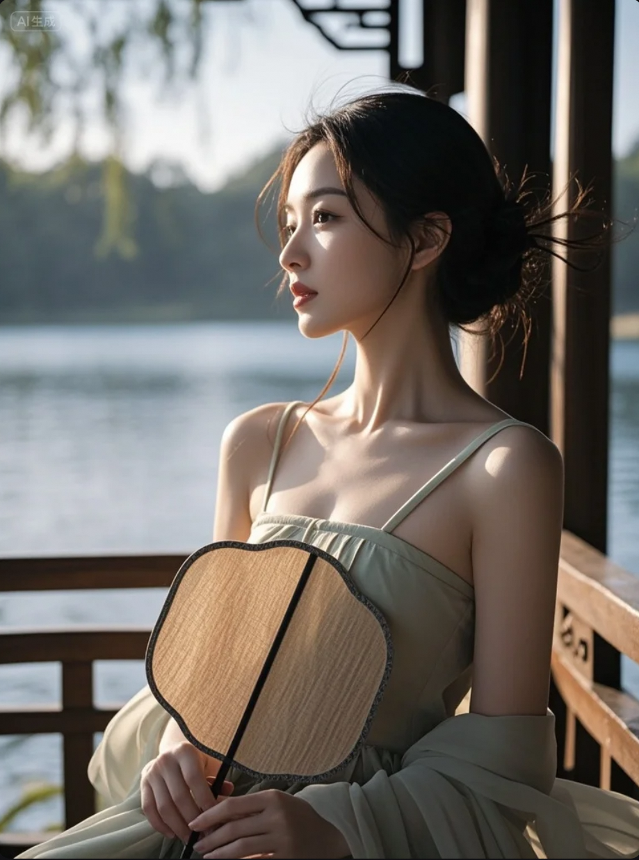她执扇立于湖畔,风起时,连倒影都在为你回眸