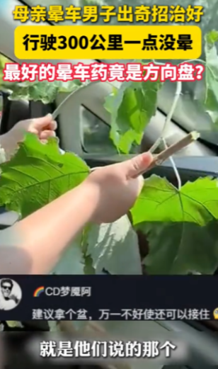 “人怎么能这么聪明!”8月10日,浙江,一男子的母亲晕车严重,为了让母亲舒服,男子找了一个树枝做方向盘,让母亲拿着,不料,竟非常有效,开了300公里,一点没有晕,网友:最好的晕车药竟然是方向盘!