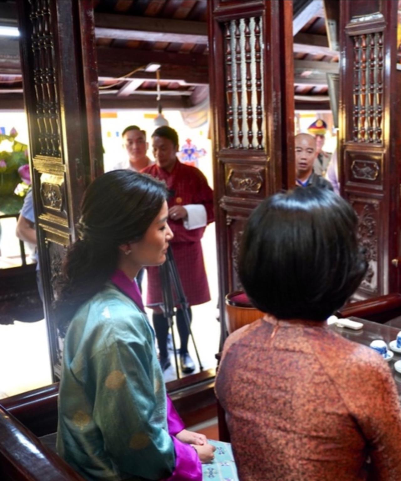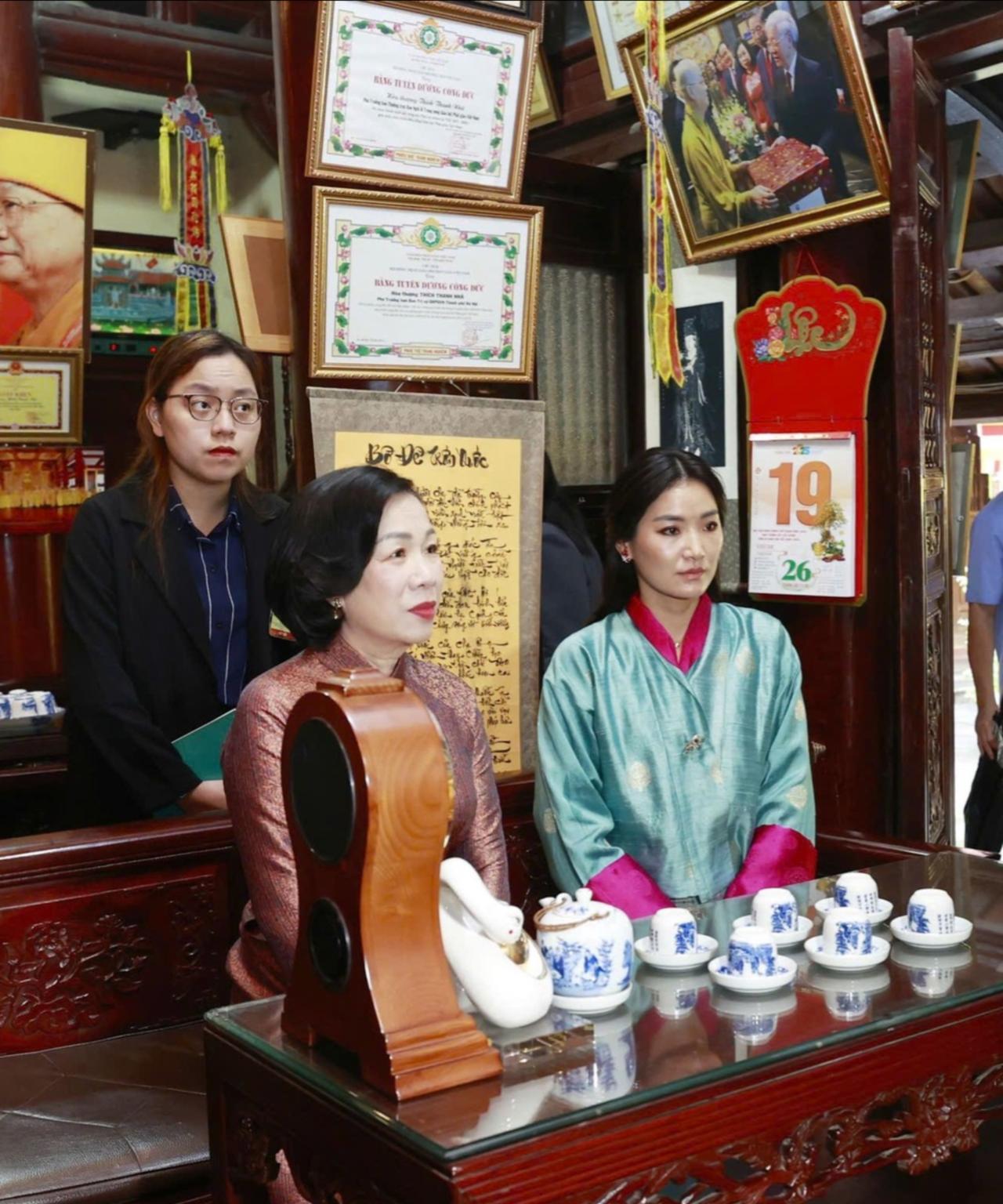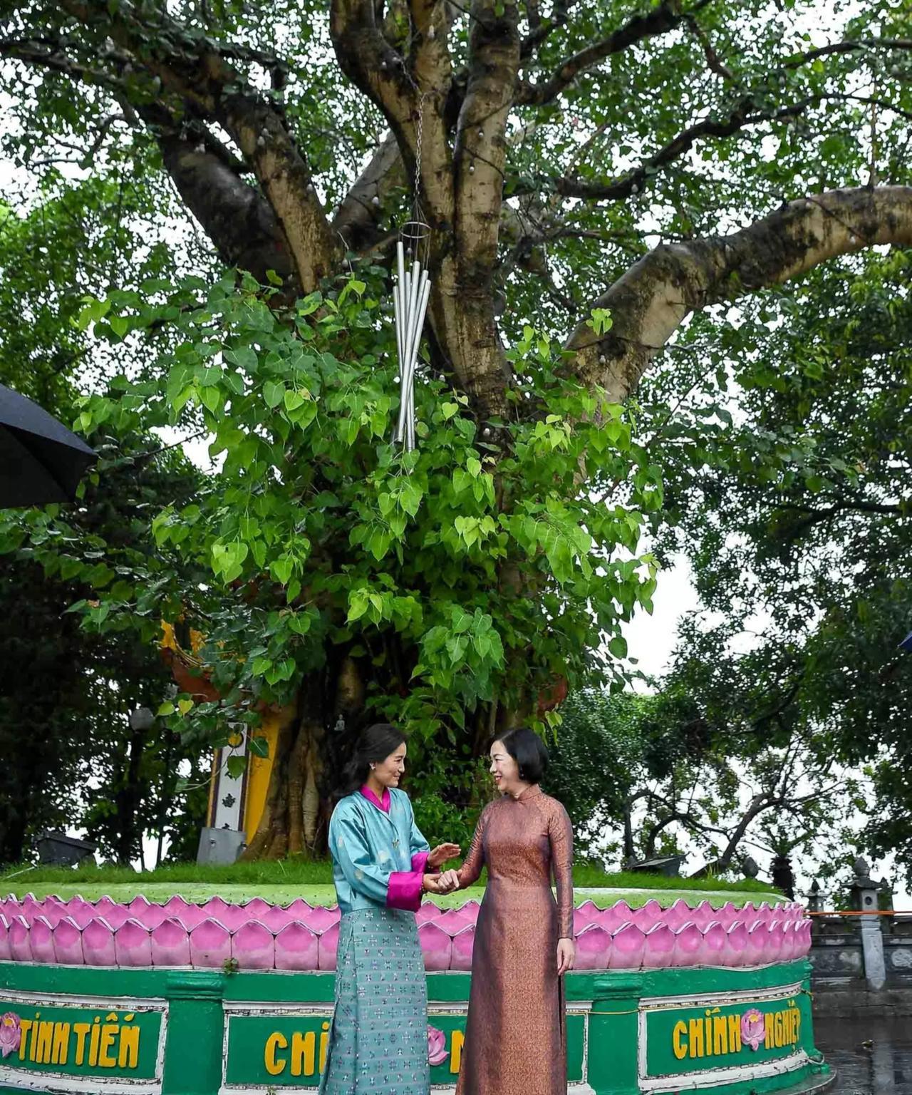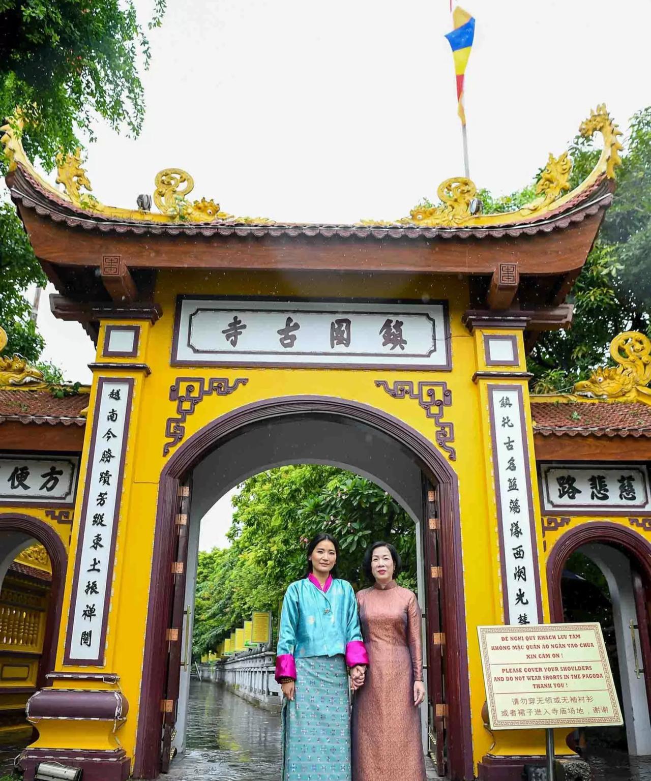 不丹王后清新脱俗,颜值和气质都在线 2025年8月19日,越南第一夫人与不丹王后佩玛,访问Tran Quoc Pagoda寺庙并献香。二人从大门步入礼拜区,西湖美景尽收眼底,众多游客挥手欢迎。住持Thich Thanh Nha介绍,此寺有近1500年历史,是河内最古老寺庙,建筑和谐,多次获评世界最美宝塔之一。庭院菩提树源自印度,僧侣赠以艺术和念珠制作的玫瑰叶。王后称两国虽地理、文化有别,但同奉佛教价值观,望未来住持和越南僧侣访不丹。佩玛王后还赠佛像和手绘香品,随后依越南佛教仪式参加主厅祈祷。