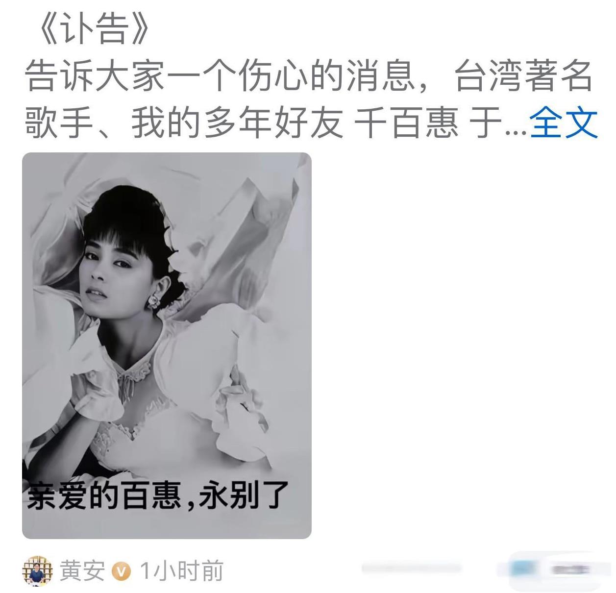 刚刚看到黄安发文:湾湾好友千百惠因病去世!脑海里立马响起《那间咖啡屋》的旋律……